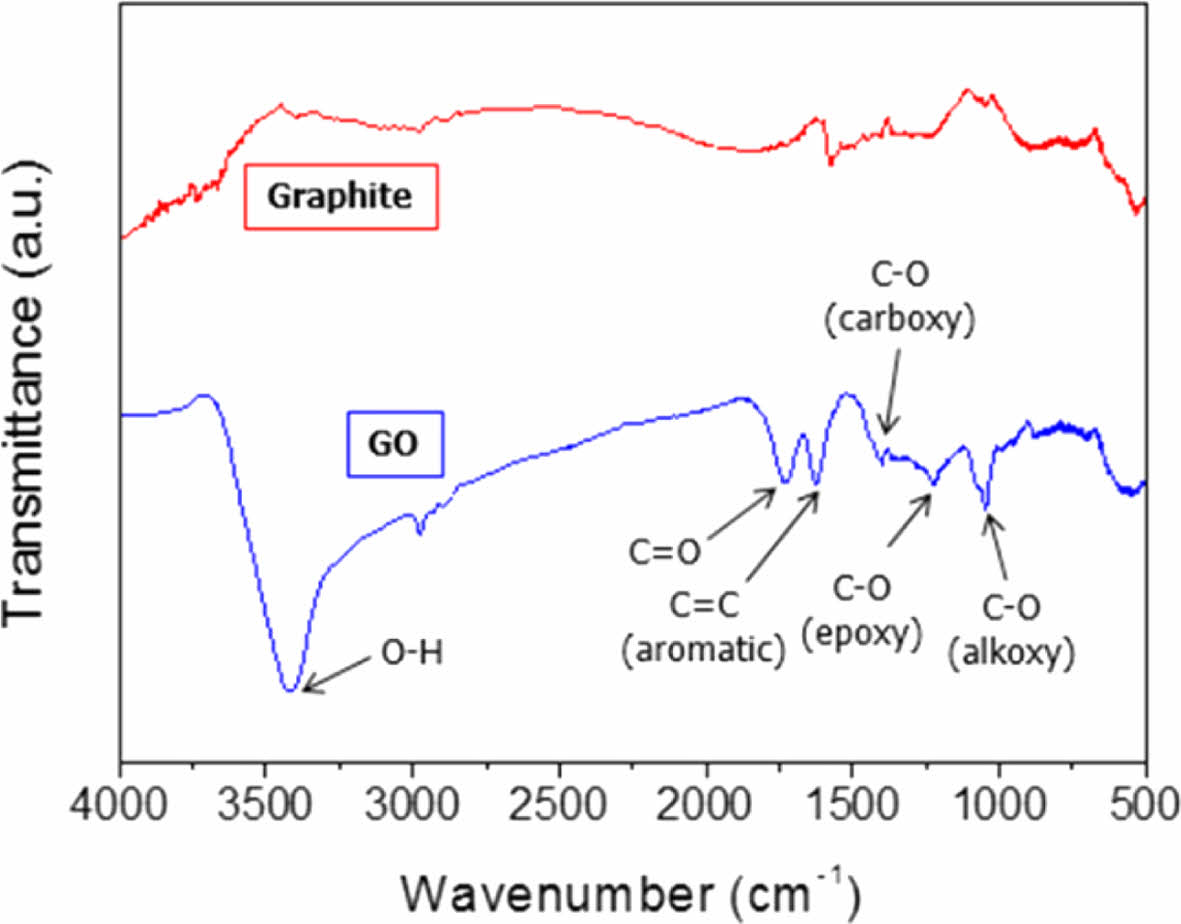 GO 제조. Figure 3에 GO와 그래파이트의 적외선 분광 스펙트럼을 나타내었다. GO의 분광 스펙트럼을 살펴보면 그래파이트의 피크(peak)에서는 보이지 않는 카보닐기(C=O, 1734 cm-1), 카복실기의 C-O(1399 cm-1), 에폭시의 C-O (1223 cm-1), 알콕시의 C-O(871 cm-1) 등이 나타남을 확인할 수 있다. 또한 3420 cm-1 주변의 넓은 흡수 밴드를 통해 하이드록시기(O-H)가 있음을 확인할 수 있다. 이를 통해 그래파이트가 정상적으로 산화되어 GO가 만들어졌음을 확인할 수 있다.16