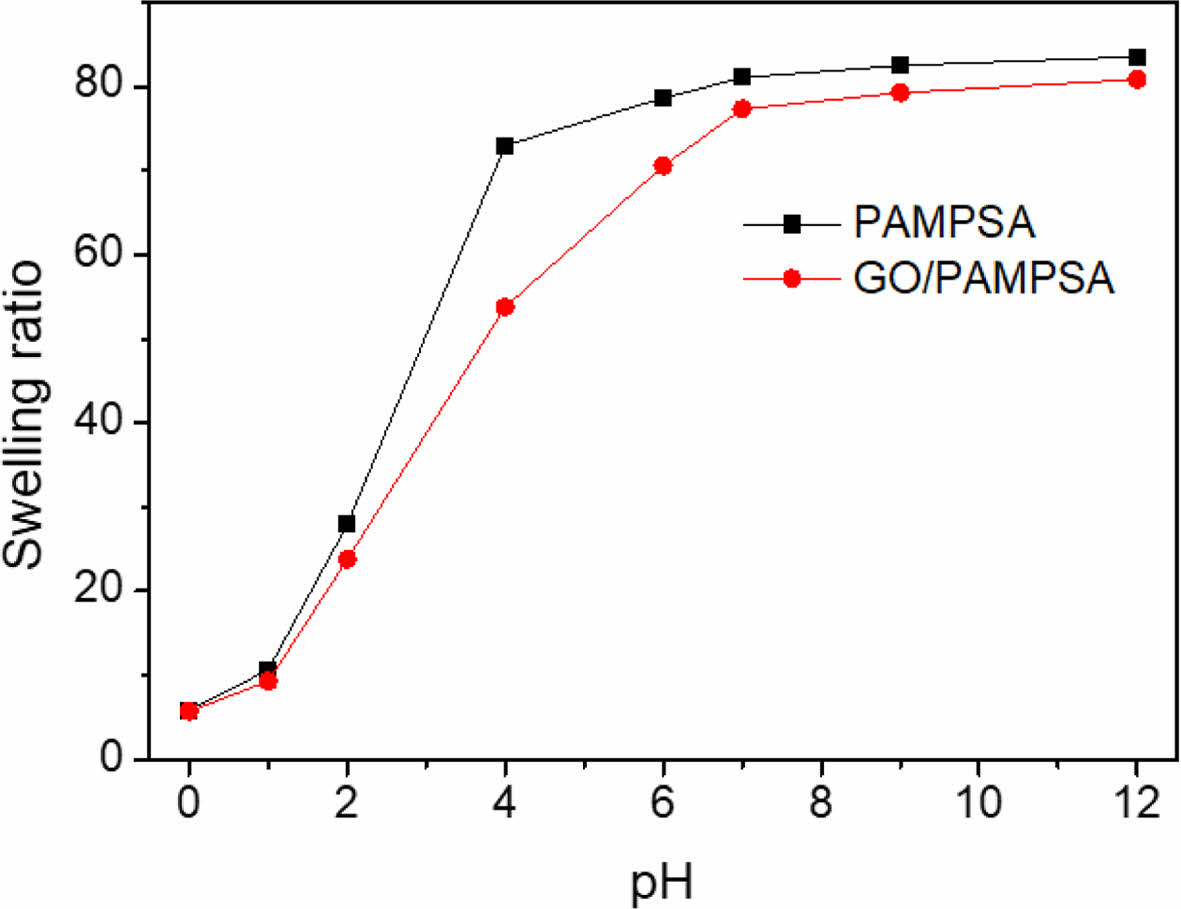Figure 4 Swelling ratio of PAMPSA and GO1.5/PAMPSA hydrogels at different pH values. |