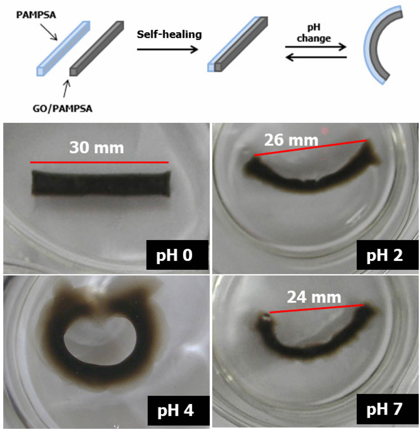 Bi-layer hydrogel composed of poly(2-acrylamido-2-methyl-1-propanesulfonic acid) (PAMPSA) and graphene oxide (GO)/PAMPSA was manufactured by self-healing method. Bi-layer hydrogel showed large bending deformation at a specific pH due to changes in water contents according to the pKa difference between the sulfonic acid group of PAMPSA and the carboxyl group of GO. Also, Bi-layer hydrogel maintained reversibility of bending deformation during repeated pH changes.