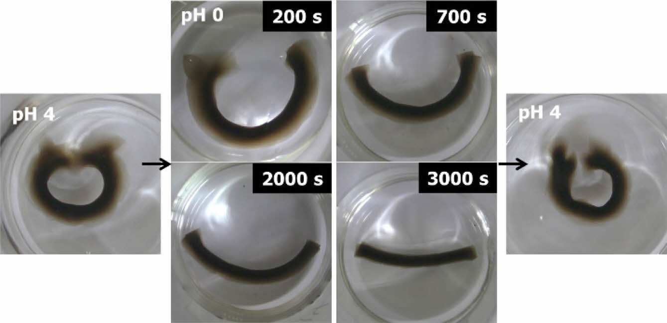 수화젤을 센서로 활용하기 위해서는 굽힘 변형의 가역성이 확보되어야 한다. 수화젤을 pH 4 용액과 pH 0 용액에 교대로 넣으면서 굽힘 변형을 관찰한 사진을 Figure 6에 나타내었다. pH 4 용액에서 양쪽 끝이 맞닿은 수화젤을 pH 0 용액에 넣어두면 천천히 펴지면서 50~60분 후 거의 일직선(L ³ 29 mm)으로 돌아왔으며, 다시 pH 4 용액에 넣으면 빠르게 원형으로 굽어지는 것을 확인하였다. 이 과정을 3회 반복했을 때까지는 수화젤의 양 끝이 완전히 닿아 있었다. 가장 오른쪽의 사진은 이 과정을 5회 반복한 사진으로 양 끝의 직선길이는 1 mm 이하이다.