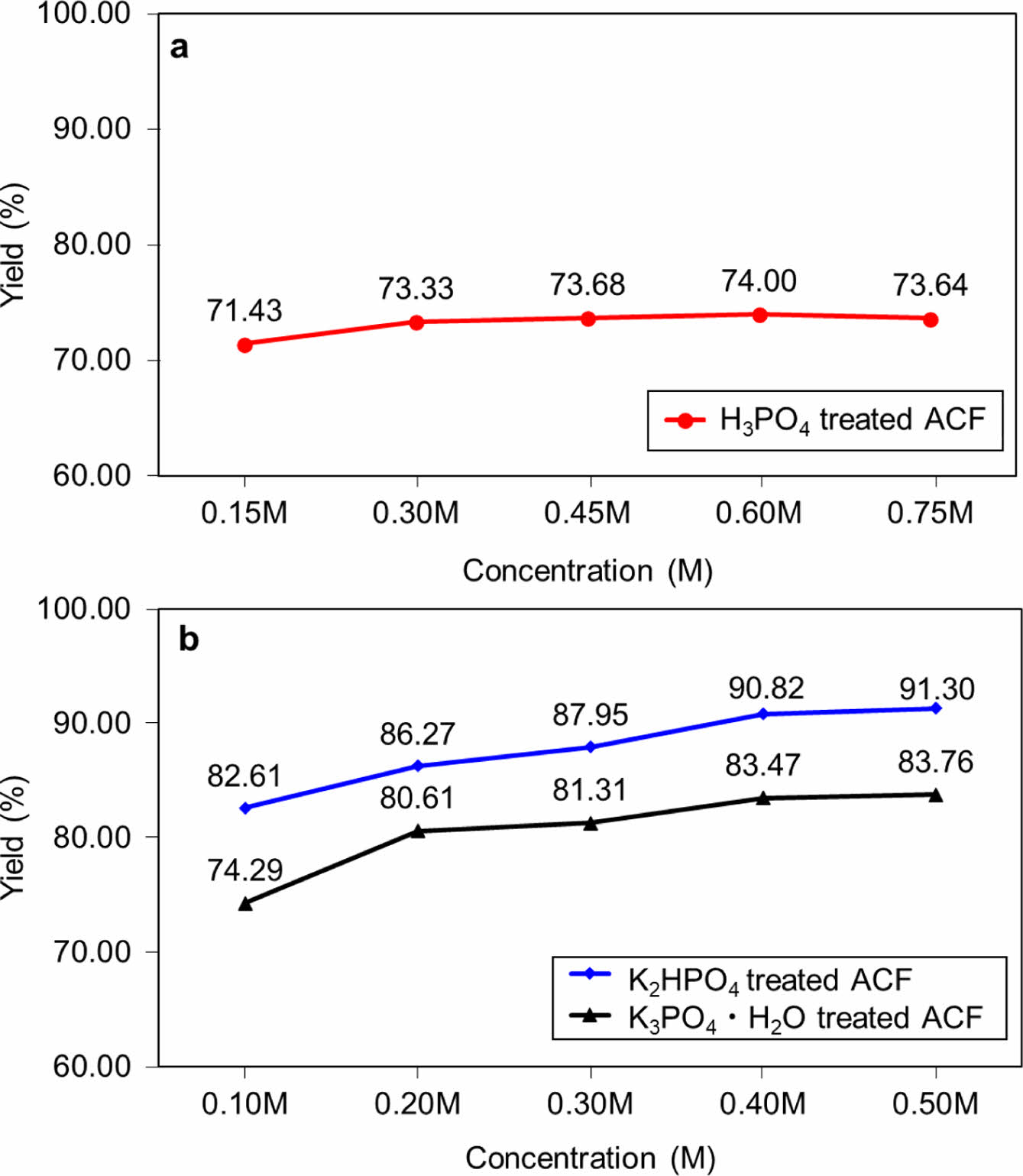 During the synthesis process of K2HPO4 and K3PO4 + H2O, KOH formation and deliquescence processes were initiated throughout the deposition and washing stages, which contributed to the enhancement of the micropore structure. In contrast, the application of H3PO4 induced char formation, consequently augmenting the thermal stability and flame retardancy of both the manufacturing process and the end products.11 To monitor the fiber yield concerning the concentration of the phosphoric acid-treated samples, the concentration was varied between 0.1 and 0.5 M. For H3PO4, concentrations ranging from 0.15 to 0.75 M were employed. The samples were immersed in three types of chemical solutions for 24 hr before being transferred to a desiccator for an additional 24 hr at 70 ℃.