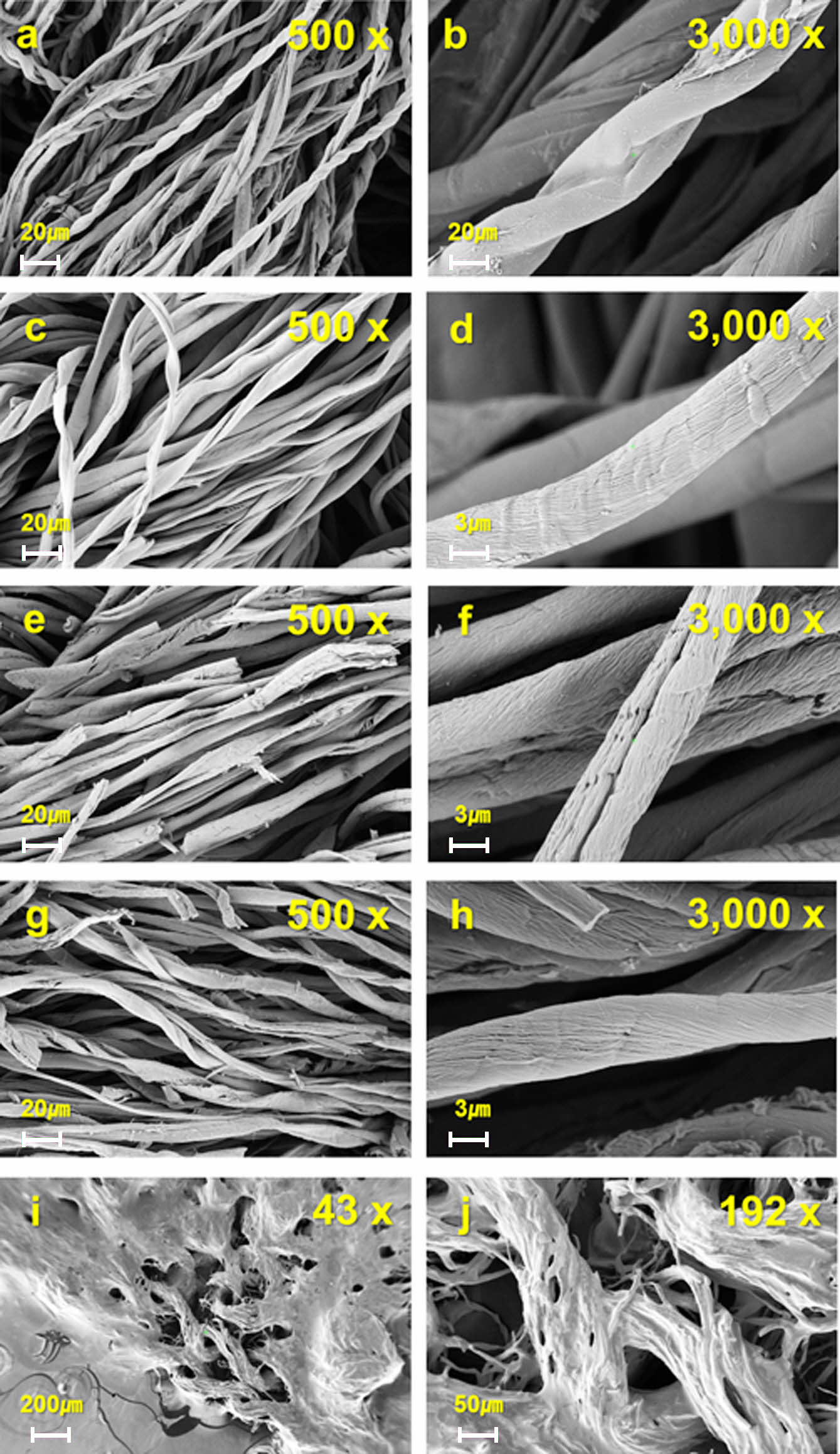 To support the numerical values of surface characteristics, samples were visually confirmed using SEM (Figure 3). Here, blank samples refer to cellulose fiber wastes. In all cases, observable damage was found on the surface of the chemically modified sample compared to the blank sample. Damages from the samples containing K content are mainly due to the newly introduced KOH. Non-washed samples seemed very limited for commercial use because they showed a loose shape beyond the fiber shape (Figures 3(i)-(j)). It is confirmed that designing flame-retardant activated carbon fibers by applying H3PO4 alone seems to be an effective method showing better physicochemical characteristics compared to other samples.