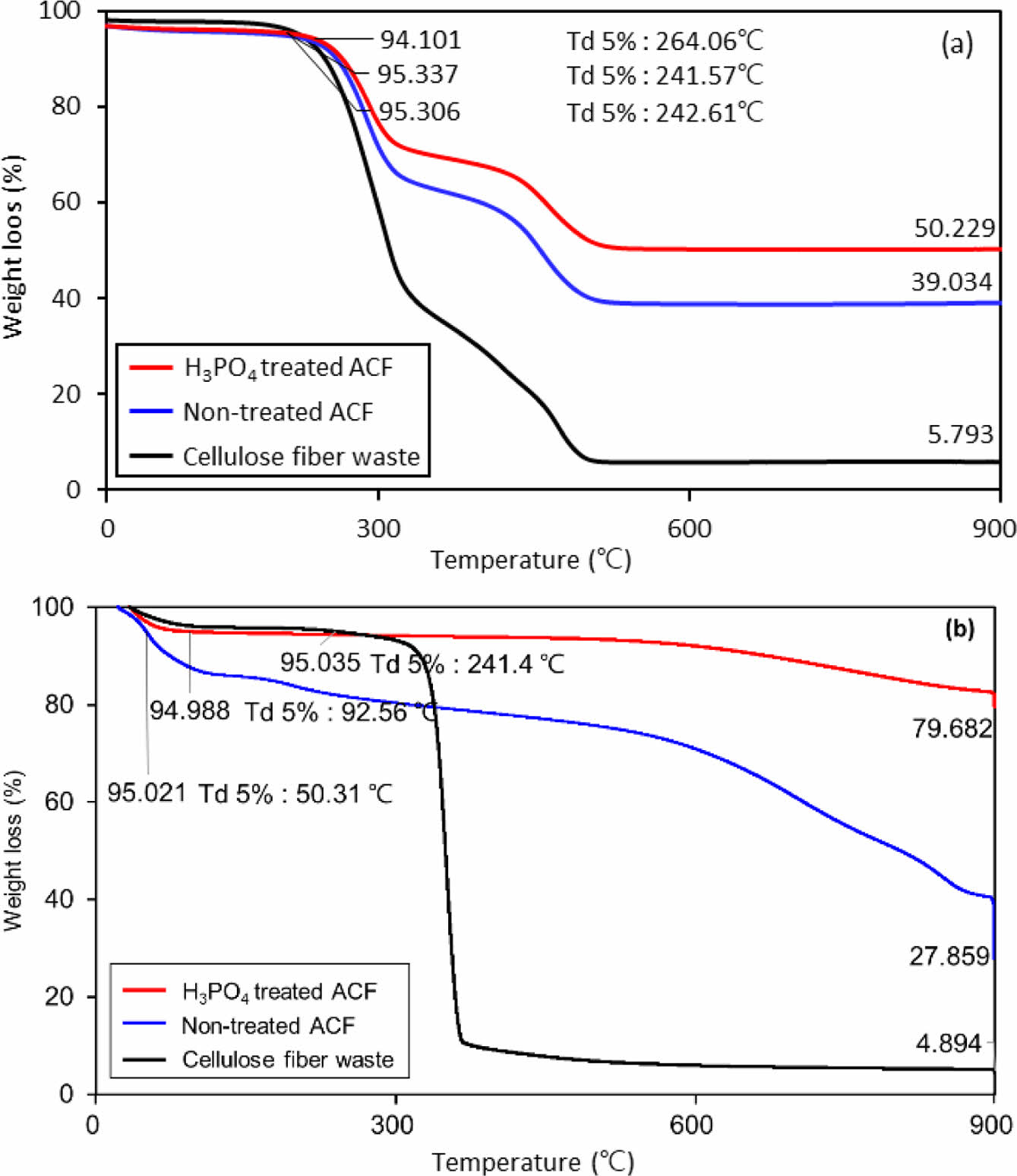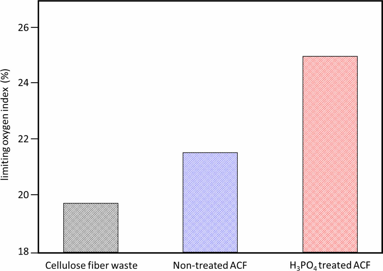 In general, a LOI value below 17 is considered flammable and above 17 is considered flame retardant. All samples were in the flame retardant range, in the order of H3PO4 treated ACF > non-treated ACF > cellulose fiber waste. The oxygen index was found to be improved, and the LOI value of H3PO4 treated ACF increased by about 20% compared to cellulose fiber waste. It can be attributed that the addition of H3PO4 promotes the formation of char in the fiber and delays or inhibits combustion in the protective layer.