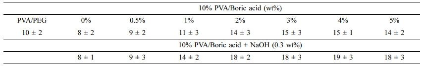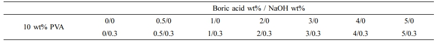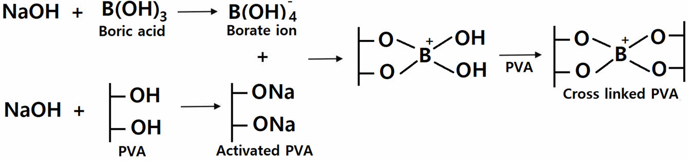 이번 연구의 컨셉은 Figure 1과 같다. PVA의 -OH작용기가 NaOH에 의해 -ONa의 형태로 활성화됨과 동시에 NaOH 수용액 내의 붕산은 borate 이온 [B(OH)4-] 으로 더욱 신속하게 바뀌게 된다. 이들 간의 반응으로 인한 결과로 가교화된 PVA를 높은 효율과 빠른 속도로 얻고자 하였다.