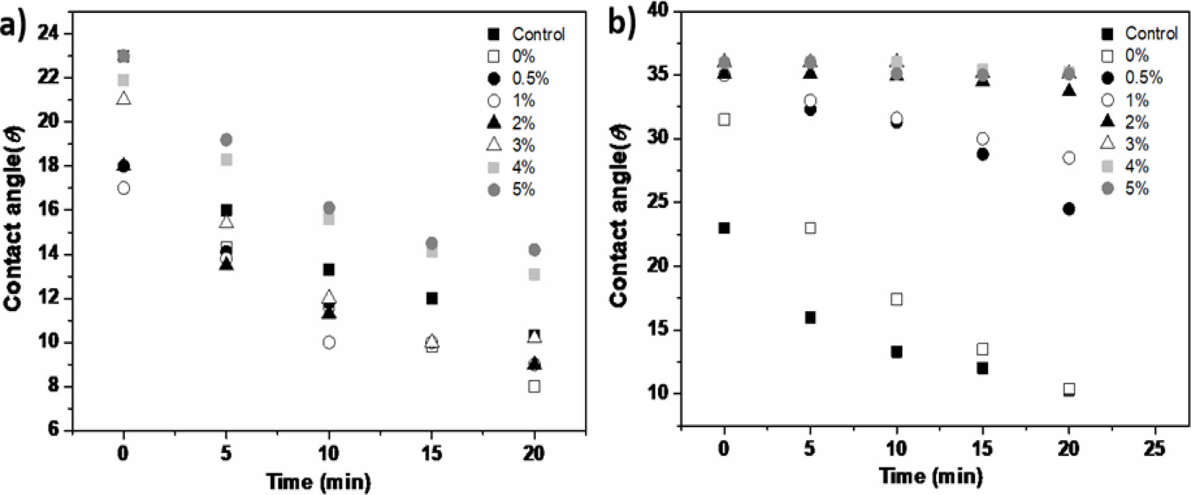 Figure 2 Contact angle of the mixtures by the (a) polyvinyl alcohol (PVA)/boric acid; (b) polyvinyl alcohol (PVA)/boric acid/NaOH. |
