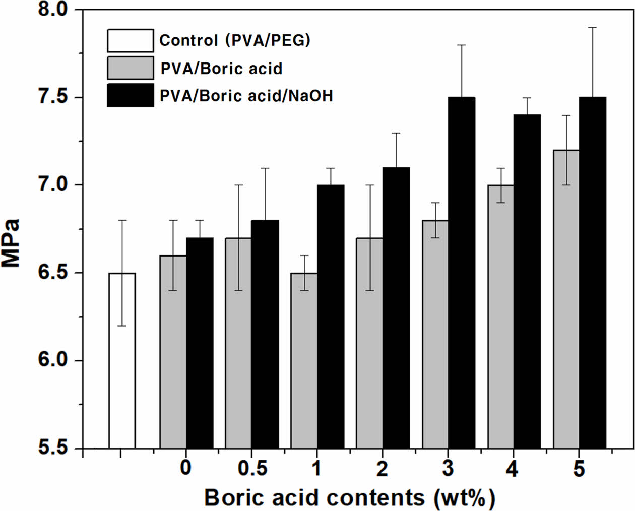 Figure 3 Differences in the amount of load under the same compressive displacement according to polyvinyl alcohol (PVA)/boric acid and polyvinyl alcohol (PVA)/boric acid/NaOH. |
