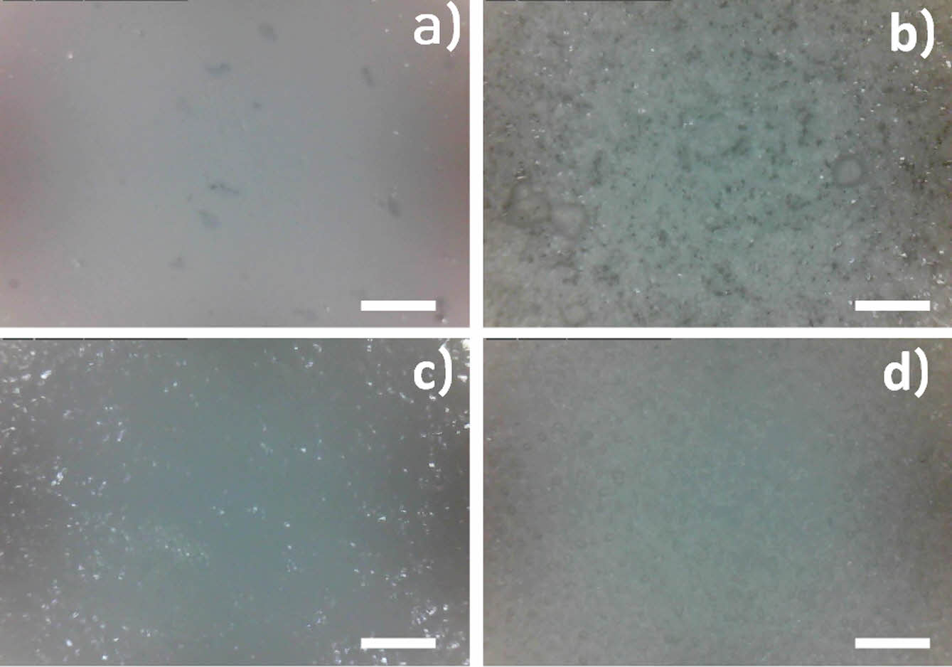 Figure 4 Surface morphological study and surface state of polyvinyl alcohol (PVA) mixtures according to boric acid and NaOH using a digital microscope: (a) Glass plate; (b) PVA/PEG; (c) PVA/ boric acid; (d) PVA/boric acid/NaOH, ×250, scale bar: 400 µm. |
