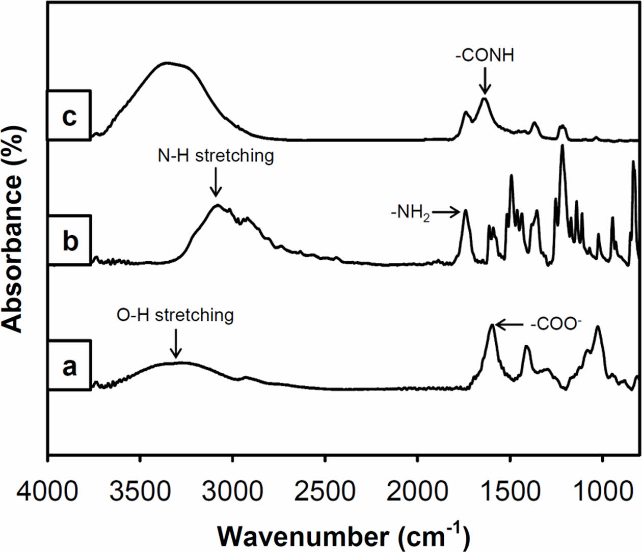 Figure 1 ATR-FTIR spectra of (a) the alginate; (b) the tyramine; (c) the modified alginate with tyramine (Alg-Tyr). The peaks of the Alg-Tyr compound of -CONH group at 1640 cm-1 and of O-H stretching at 3300-3200 cm-1 were originated from alginate and tyramine by EDC/NHS coupling reaction. |