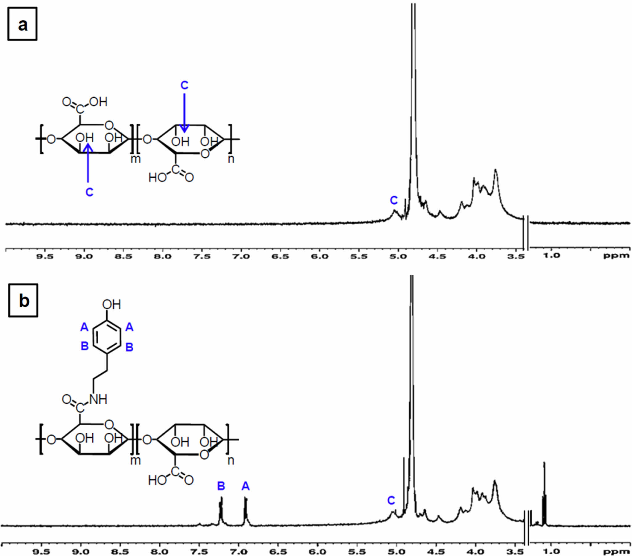Figure 2 1H NMR spectra of (a) the alginate; (b) the modified alginate with tyramine (Alg-Tyr) compound. The characteristic peaks of tyramine moiety in Alg-Tyr compound specimen were detected at (A) 6.9 ppm; (B) 7.2 ppm. The hydrogen peaks at (C) 5 ppm indicate reference peak of the alginate. |
