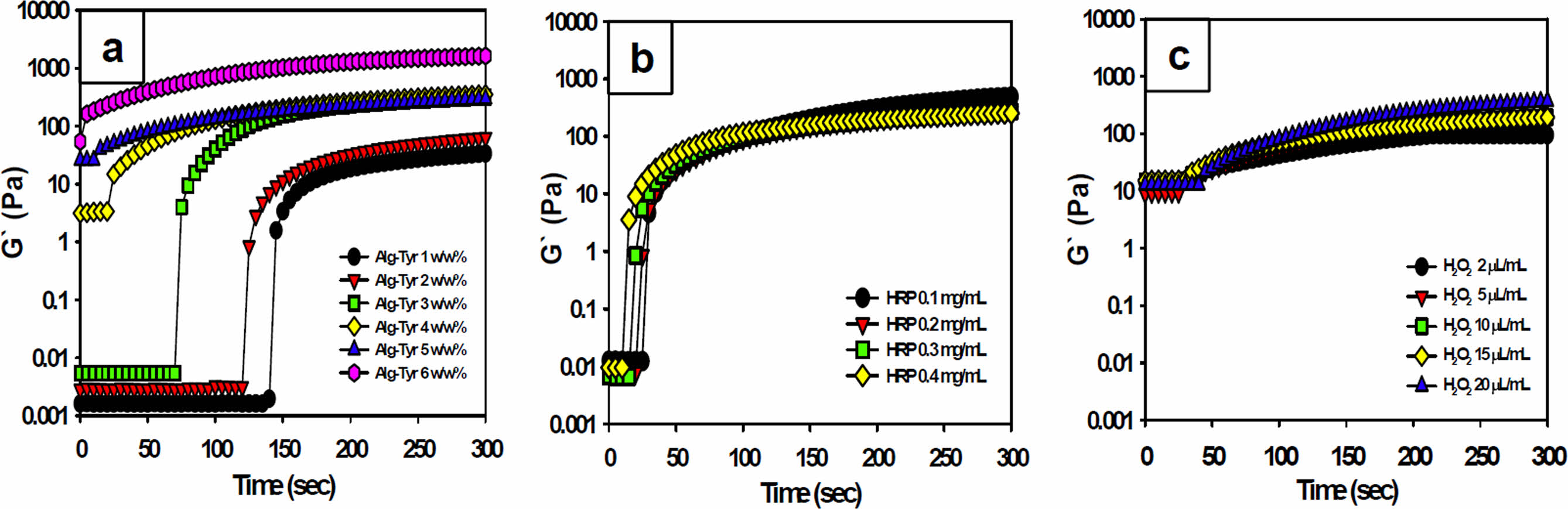 Figure 3 The storage modulus (G') of the alginate hydrogels according to concentrations of (a) the Alg-Tyr solution at HRP 0.2 mg/mL, H2O2 5 μL/mL; (b) the HRP at Alg-Tyr 4 w/w%, H2O2 5 μL/mL; (c) the H2O2 at Alg-Tyr 4 w/w%, HRP 0.2 mg/mL, respectively |