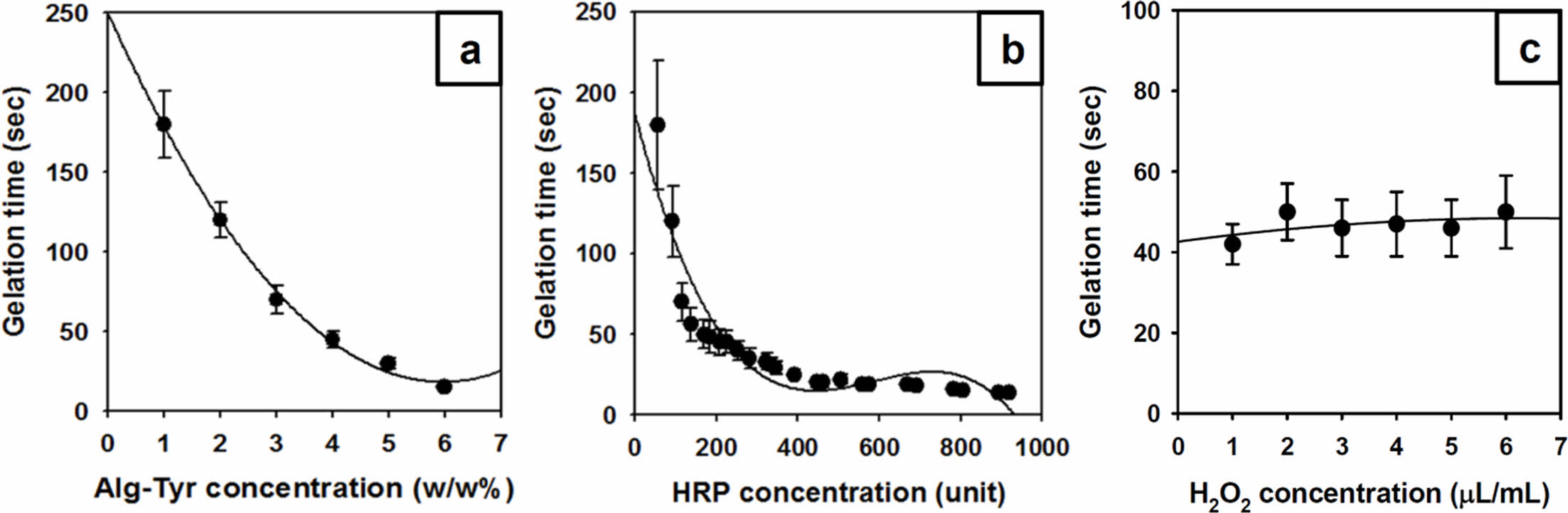 Figure 4 Gelation time of the alginate hydrogels according to concentration of (a) the Alg-Tyr solution at HRP 0.2 mg/mL, H2O2 5 μL/mL; (b) the HRP (0.2 mg/mL = 460 unit) at Alg-Tyr 4 w/w%, H2O2 5 μL/mL; (c) the H2O2 at Alg-Tyr 4 w/w%, HRP 0.2 mg/mL, respectively (n = 3). |