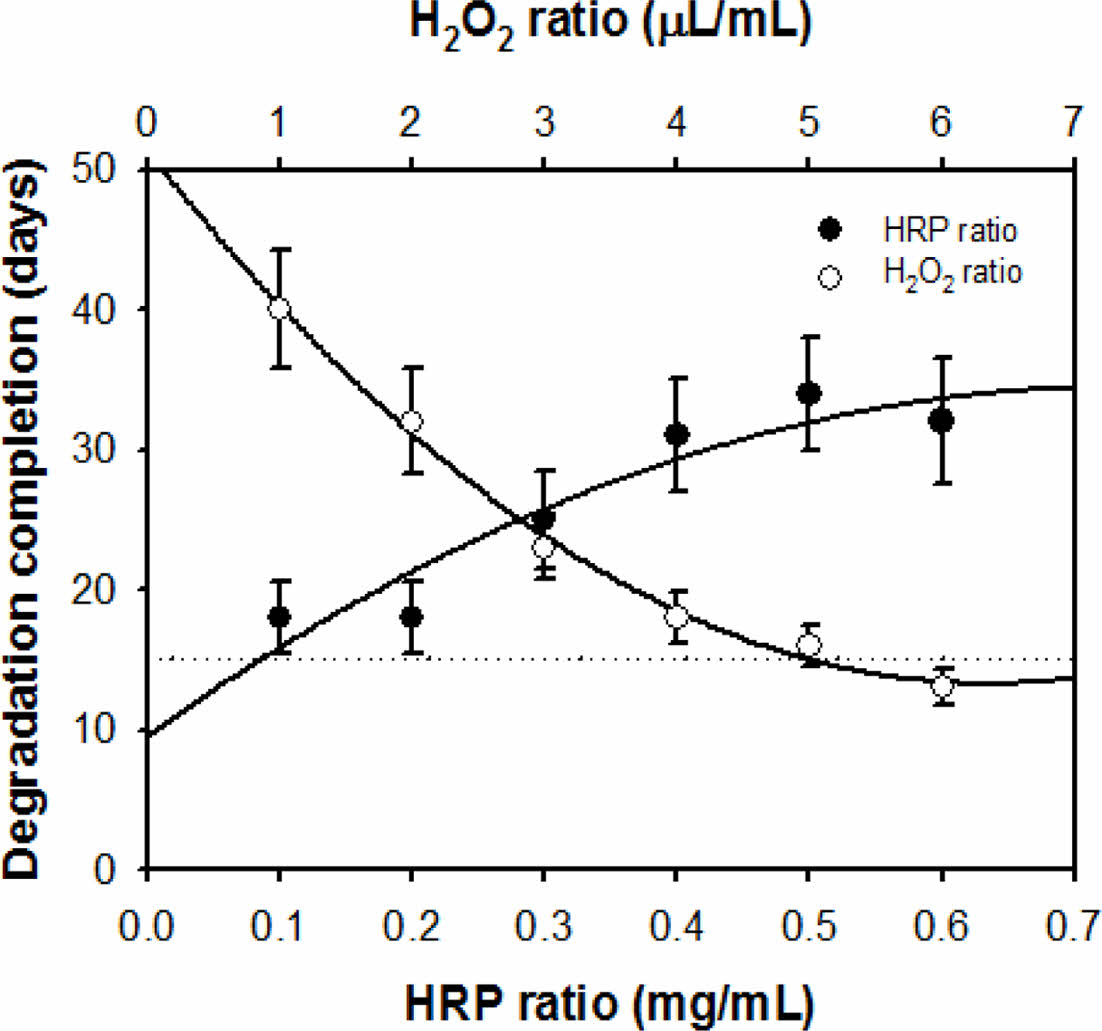 Figure 5 Hydrolytic degradation completion time of the alginate hydrogels according to the HRP (at Alg-Tyr 4 w/w%, H2O2 4 μL/mL) and the H2O2 (at Alg-Tyr 4 w/w%, HRP 0.2 mg/mL) ratios, respectively (n = 3). |