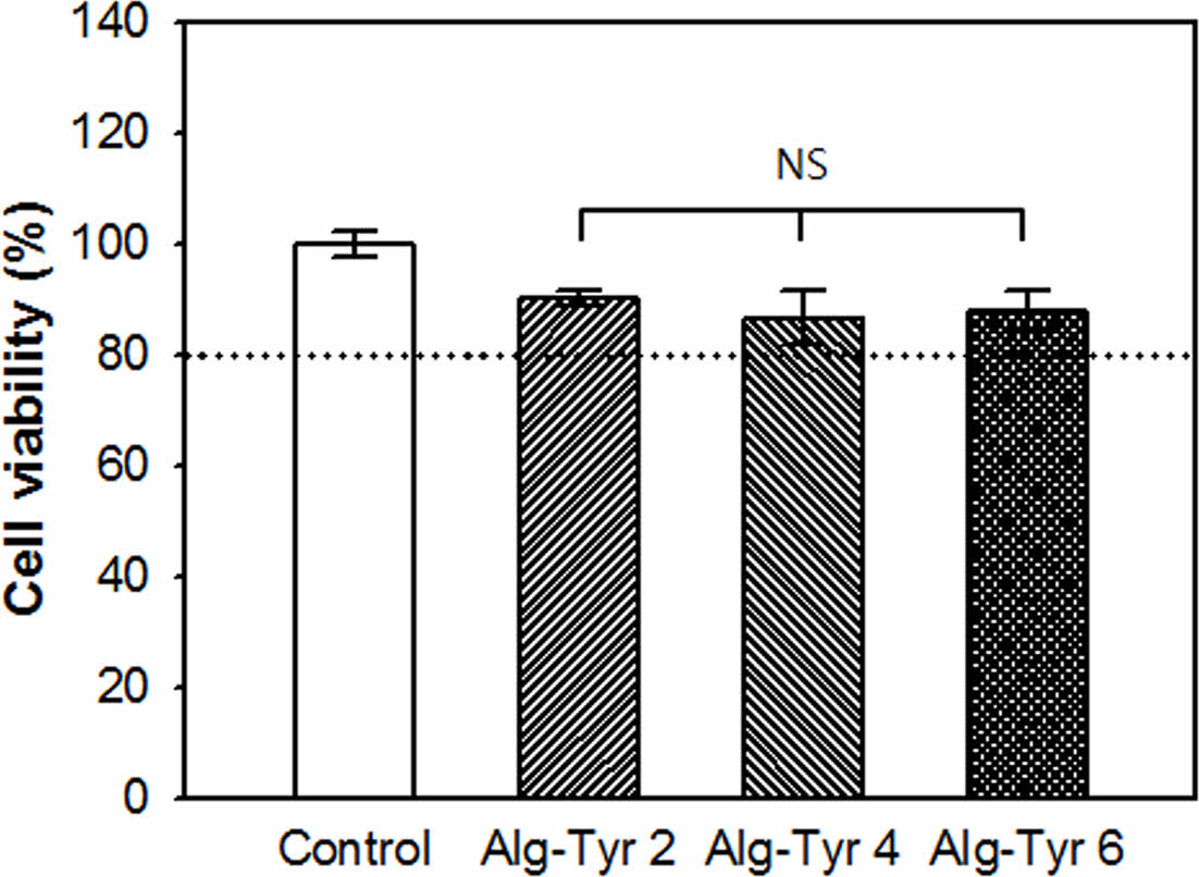 Figure 6 Cell viability of alginate hydrogels with various concentration of alginate-tyramine (Alg-Tyr) solutions (at HRP 0.2 mg/mL, H2O2 4 μL/mL with 2, 4 and 6 w/w% of Alg-Tyr) (n = 5, NS means not significant). |