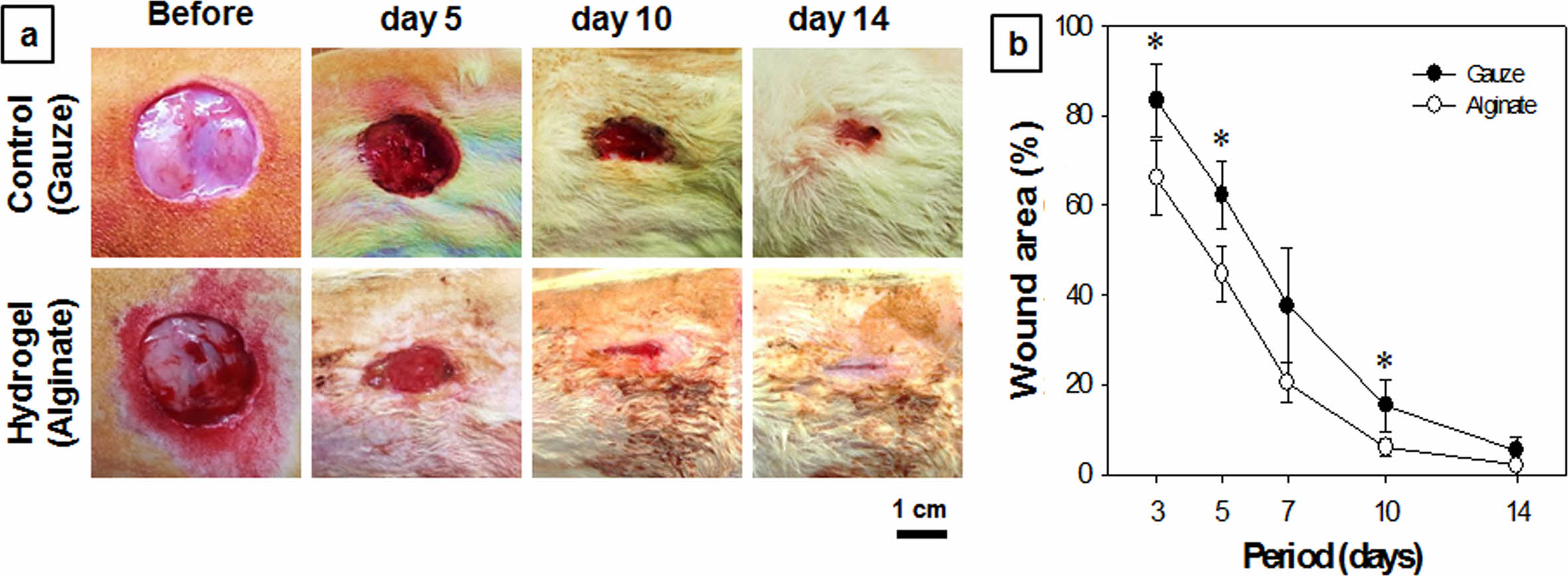 Figure 7 (a) Photographs; (b) wound area of in vivo rat skin defect model as a function of period of wounds treated with gauzes and alginate hydrogel dressings. Paired student t-test repeat with two groups (n = 5, *p < 0.05). |