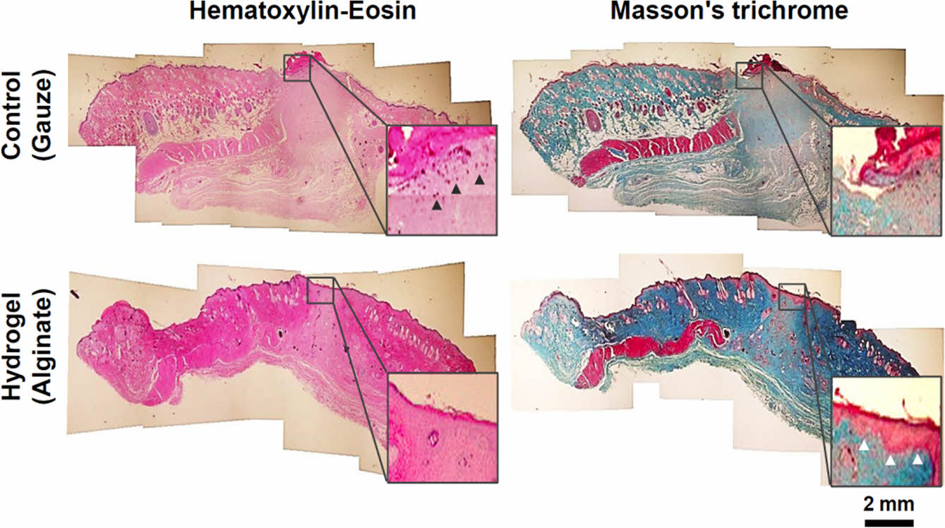 조직학적 평가. SD rat을 대상으로 한 피부전층창상 동물모델의 14일차에 조직을 채취하여 조직학적 분석을 진행하였다. Figure 8에서와 같이, H&E 및 Masson’s trichrome 조직염색을 통하여 결손된 조직경계부 종단면의 염증세포 분포와 표피조직의 재생형태 및 진피조직의 성숙도를 분석할 수 있었다. 창상을 유발한 조직의 14일차는 지혈/염증단계, 육아조직 증식단계 및 상피화의 단계 후반부와 중첩된 조직 성숙화 단계로 볼 수 있다. 대조군은 결손부 표피조직의 수복이 불완전하고 진피의 재생정도가 미성숙 상태였으며, 확대한 H&E 염색사진에서와 같이 육아조직이 과다하게 형성된 표피의 하단부에 염증세포 중에서 대식세포들이 많이 관찰되었다. 반면, 실험군은 진피의 증식상태가 대조군에 비하여 성숙한 상태였으며 선명하게 수복된 표피의 재생이 관찰되었고 염증세포가 거의 관찰되지 않았다. 또한, Masson’s trichrome 염색사진에서도 대조군의 과다한 육아조직과 불완전한 표피의 재생이 관찰되었으나, 실험군에서는 선명한 표피조직 수복 및 성숙된 진피조직의 콜라겐이 확인되었다. 이는 알긴산 하이드로젤이 결손조직의 상부표면에 밀착하여 창상치유과정의 초기에 발생할 수 있는 과도한 염증반응을 완화하고, 최적의 습윤환경을 조성함으로써 후속적인 섬유아세포의 증식 및 성숙화 단계로의 진입을 촉진한 결과에 의한 것으로 사료된다.