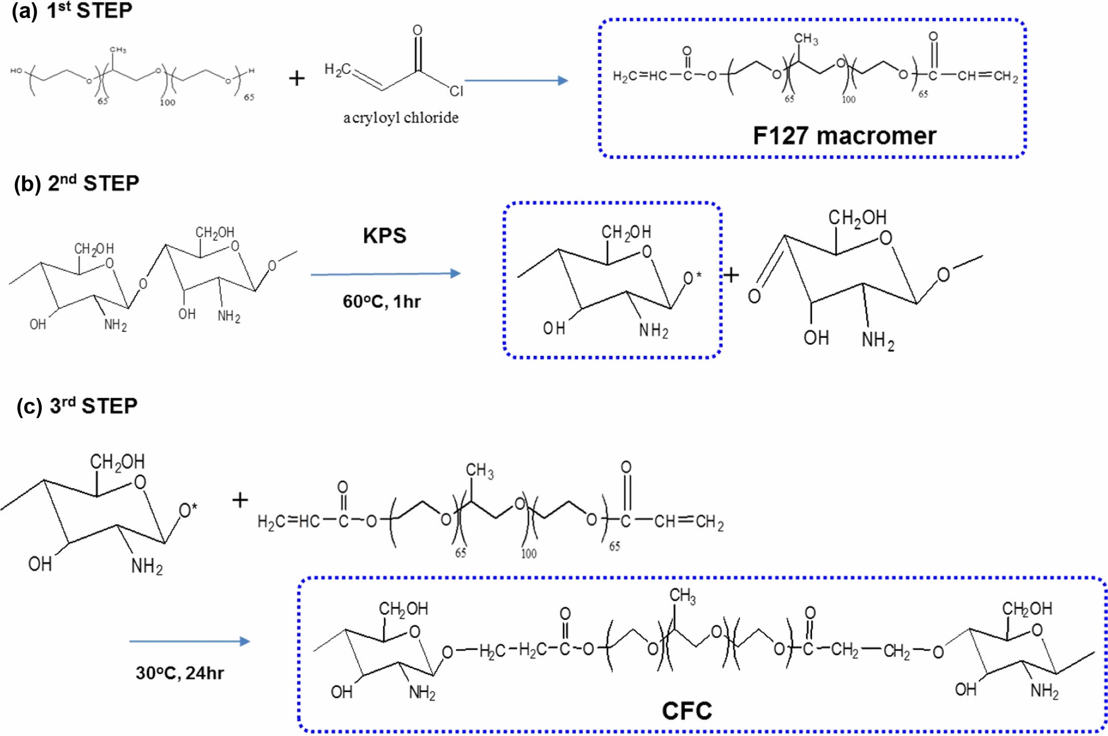 CFC를 합성하기 위하여 먼저 F127 구조내의 -OH 그룹에 acryloyl chloride를 도입시켜 이중 결합을 갖는 F127 macromere를 합성하였다(Figure 1(a)). 합성되어진 F127 macromere와 chitosan을 이용하여 A-B-A형태의 삼블록 공합체로 합성하기 위하여 KPS를 이용하여 키토산의 메인 사슬의 β-1,4 glycoside bond(-C-O-C-)를 끊고 여기에 활성 라디칼을 형성시킨 후 F127 macromere를 도입함으로써 CFC를 합성하였다(Figure 1(b,c)). 키토산 사슬이 분해됨에 따라 형성되는 라디칼 종은 KPS의 양과 반응시간에 따라 결정되고, 이는 키토산 분자량에 영향을 미치게 된다. 그 최적화된 반응공정 KPS양 및 반응시간을 본 연구에 적용하여 합성하였다.17 CFC 삼블록 공중합체의 합성 유무를 확인하기 위해 FTIR과 1H NMR을 이용하여 구조 분석을 통해 규명하였다.