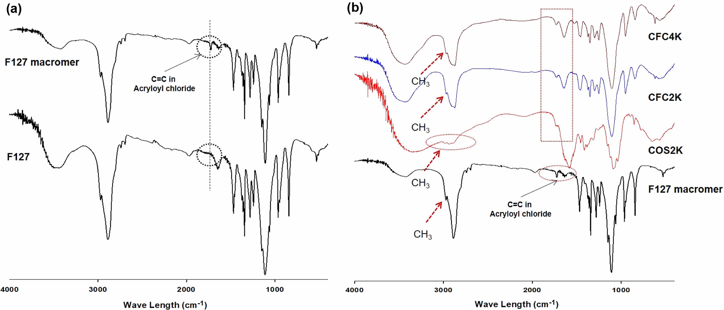 Figure 2는 FTIR를 이용하여 F127 macromere 및 CFC의 구조를 분석한 결과이다. F127의 경우 acryloyl chloride가 F127 -OH group에 도입되어 약 1800 cm-1에서 acryloyl chloride의 –C=C- 특성피크가 관찰됨으로써 F127 macromere가 성공적으로 합성되었음을 확인하였다(Figure 2(a)). 또한, CFC의 경우 라디칼 반응에 의해 acryloyl chloride에 존재하는 C=C 결합이 C-C 단일 결합으로 변화되어 1800 cm-1에서 acryloyl chloride에 C=C 특성 피크가 사라짐을 확인함과 동시에 2900-3000 cm-1에서 CH3에 의한 특성 피크가 키토산에 의해 나타나는 특성 피크와 겹쳐서 나타나는 것을 확인하였다(Figure 2(b).