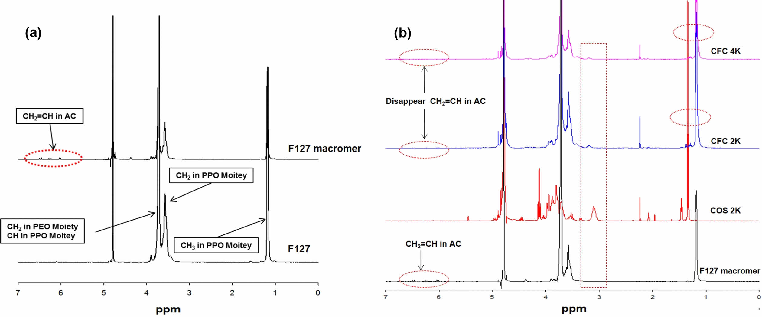 Figure 3 1H NMR spectra of (a) F127 macromer; (b) CFC. |