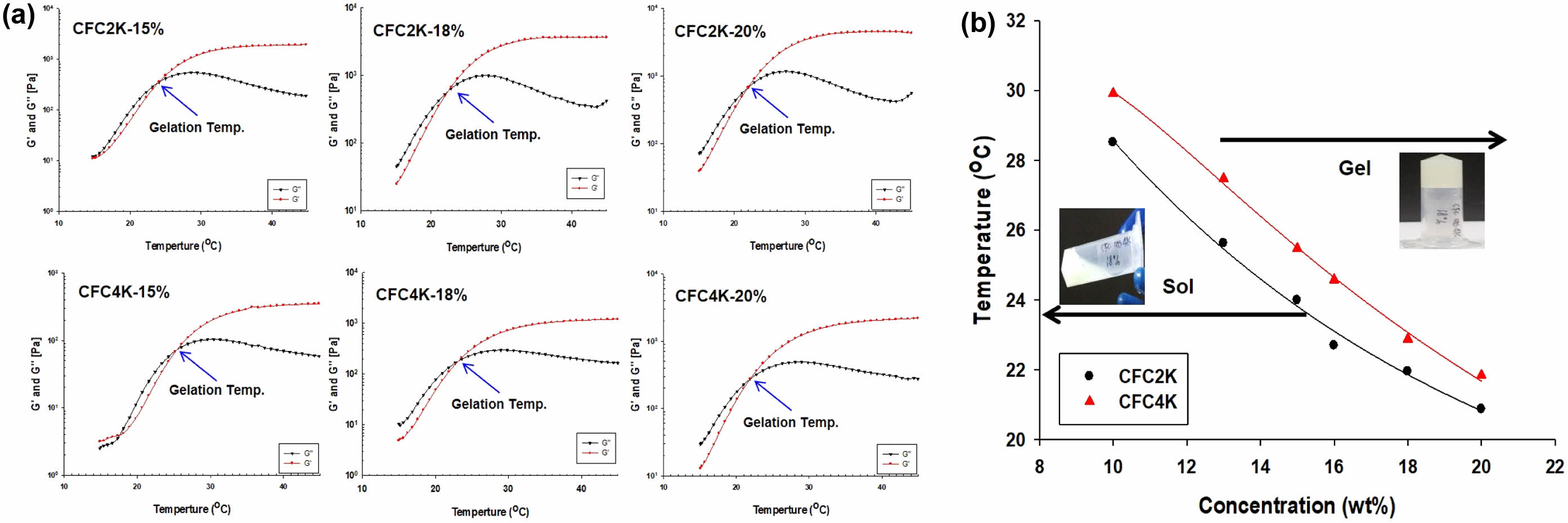 졸-젤 전이 거동을 규명하는 방법으로 온도에 따른 탄성모듈러스(G′)과 점성모듈러스(G″)의 변화를 관찰하여 G′과 G″의 교차점을 이용하여 gelation 온도를 규명할 수 있다. 하이드로젤을 형성하는 물질의 경우 낮은 온도에서는 점성모듈러스의 영향을 많이 받으며, 온도가 상승함에 따라 탄성모듈러스의 영향을 많이 받게 된다. 온도에 따른 CFC2K, CFC4K 모듈러스의 변화를 Figure 4(a)에 각각 나타냈다. 각각의 gelation 온도의 증가에 따라서 G′과 G″의 교차점을 정확하게 확인할 수 있었으며, 농도가 높아질수록 gelation 온도가 낮아지는 것을 관찰할 수 있었다. 정확한 결과는 Table 2에 요약하였다. 결과에서 볼 수 있듯이 CFC2K의 경우 농도가 증가함에 따라서 gelation 온도가 28 ℃에서 20 ℃로 낮아졌다. 또한 CFC4K의 경우 30 ℃에서 22 ℃로 낮아지는 것을 확인할 수 있었다.