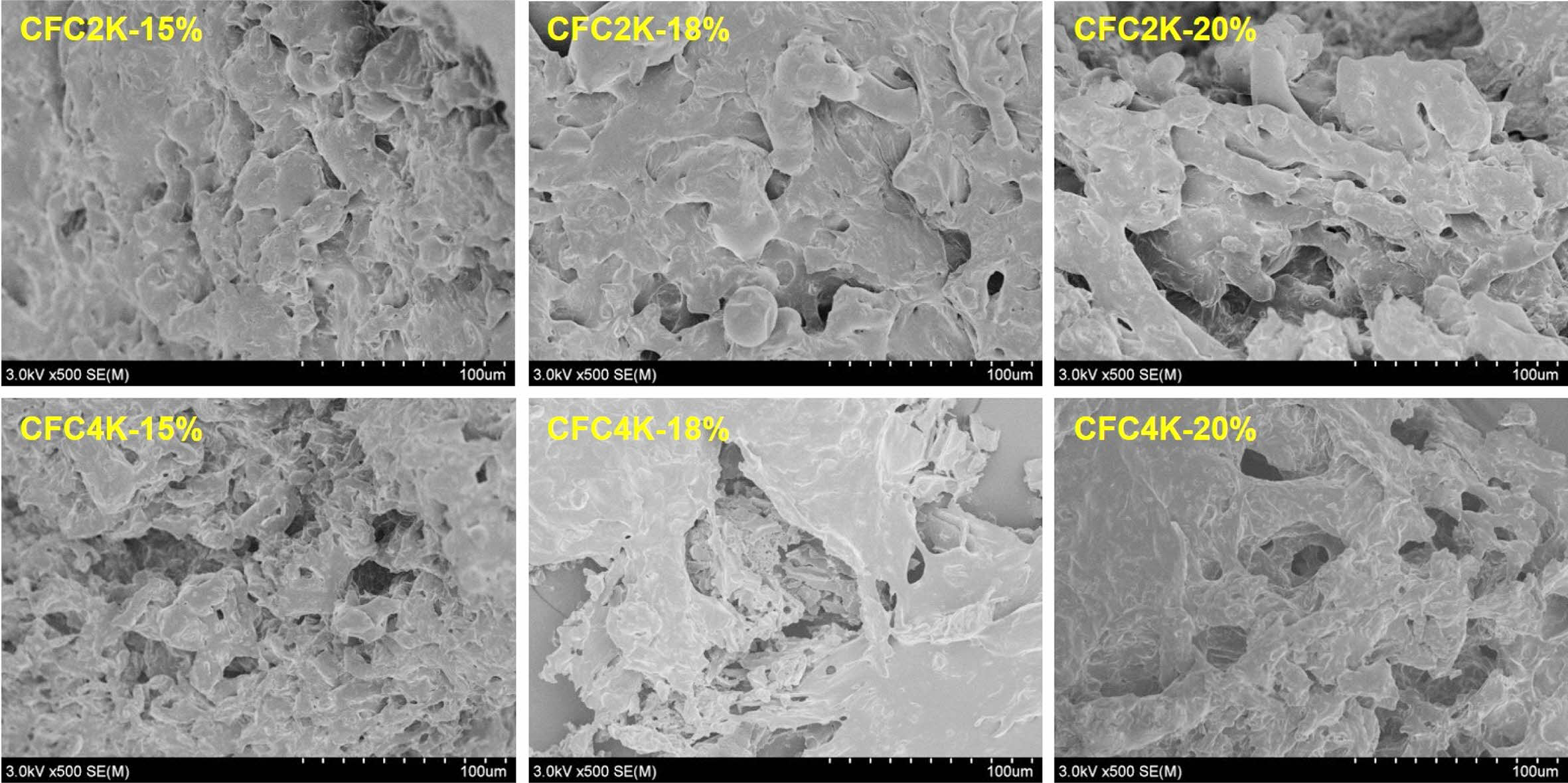 CFC 하이드로젤의 모폴로지 특성 분석. CFC hydrogel의 미세구조의 모폴로지 특성은 주사전자현미경(filed emission scanning electron microscopy, FE-SEM, HITACHI S-4800, Japan)을 이용하여 관찰하였다. 농도(15, 18, 20 wt%)에 따라서 제조된 CFC 하이드로젤을 2일간 동결 건조하여 수분을 완벽하게 제거하였다. FE-SEM 분석을 위하여 건조된 샘플의 단면을 취하여 백금으로 30초 동안 코팅하였다. 이후 단면의 형태를 가속전압 3 kV에서 다양한 배율로 관찰하여 단면 미세구조 이미지를 얻었다.