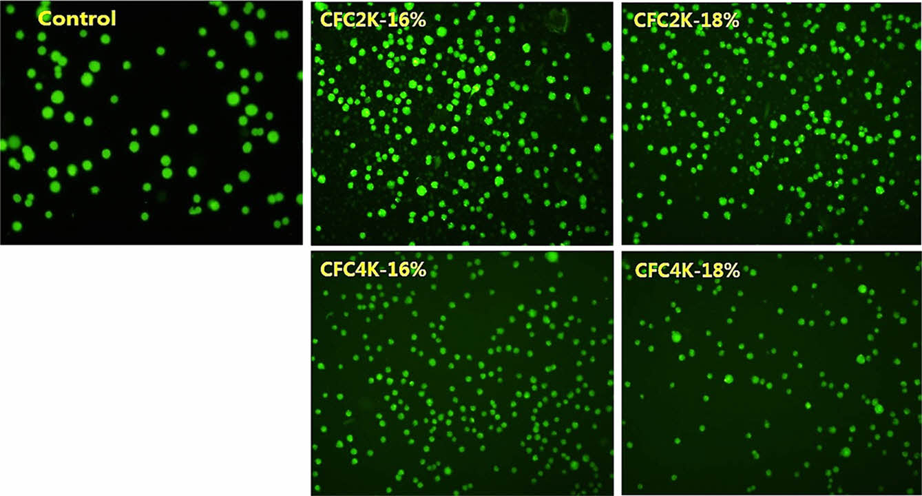 CFC 하이드로젤에서 세포의 Live/dead Assay. CFC2K와 CFC4K를 DMEM 배지에 각각 용해하여 15, 18% 용액을 제조하고, 이를 200 μL를 취해 24-well에 분주하고 겔 형성을 위해 36 ℃ incubator에서 10분간 방치 후 배양된 AGS 세포를 5 × 103 cell/well를 각각 분주하였다. 72시간 동안 각각 배양 후에 PBS로 세척 후 calcein-AM 4 μM를 처리하여 1시간 후에 형광현미경으로 세포의 생존 여부를 확인하였다.