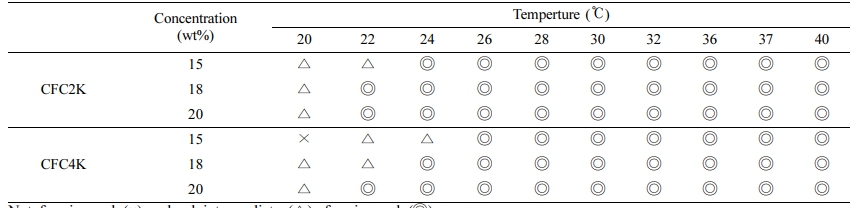 Table 1은 vial invert method로 졸-젤 전이 현상을 관찰한 결과이다. CFC2K의 경우 15%에서는 24 ℃, 그 이상의 농도에서는 22 ℃에서 졸-젤 전이 현상을 관찰할 수 있었다. 그리고 CFC4K 농도가 15%의 경우 25 ℃, 18%에서는 24 ℃, 20%에서는 22 ℃에서 졸-젤 전이 현상이 관찰되었다. 이 결과로부터 동일한 물질에서는 농도가 높을수록 상대적으로 낮은 온도에서 졸-젤 전이 현상이 나타남을 알 수 있었다. 또한 분자 구조 내 친수성 그룹의 양에 따라서 비교할 경우, 동일한 농도에서 친수성 그룹의 분자량이 클수록 졸-젤 전이 온도가 높아지는 것을 알 수 있었다.
