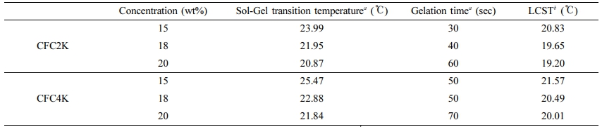 온도감응성 하이드로젤은 온도의 증가에 따라서 용액 점도가 증가하게 된다. 따라서 온도 상승에 따른 용액의 점도를 측정함으로써 물질의 임계하한용액온도(low critical solution temperature, LCST)를 규명하였다. 본 연구에서 합성된 CFC의 LCST는 레오미터를 이용하여 온도 증가에 따른 점도의 변화를 측정하였으며, 이 결과는 Table 2에 요약하였다. 결과에서 볼 수 있듯이 CFC2K, CFC4K 모두 약 20 ℃ 부근에서 LCST를 보였다. 동일 물질의 경우 농도가 높아질수록 LCST가 낮아 졌으며, 동일 농도의 경우 친수성 그룹이 증가할 수록 높아졌다. 이러한 결과로부터 친수성 그룹이 도입되지 않은 순수한 F127의 경우 이 온도보다 낮은 온도에서 LCST를 보일 것으로 예측할 수 있다. 이러한 연구결과를 통해 합성된 CFC는 상온에서 상 전이 제어가 유용하여 조직공학 지지체로써 활용이 가능할 것으로 사료된다.