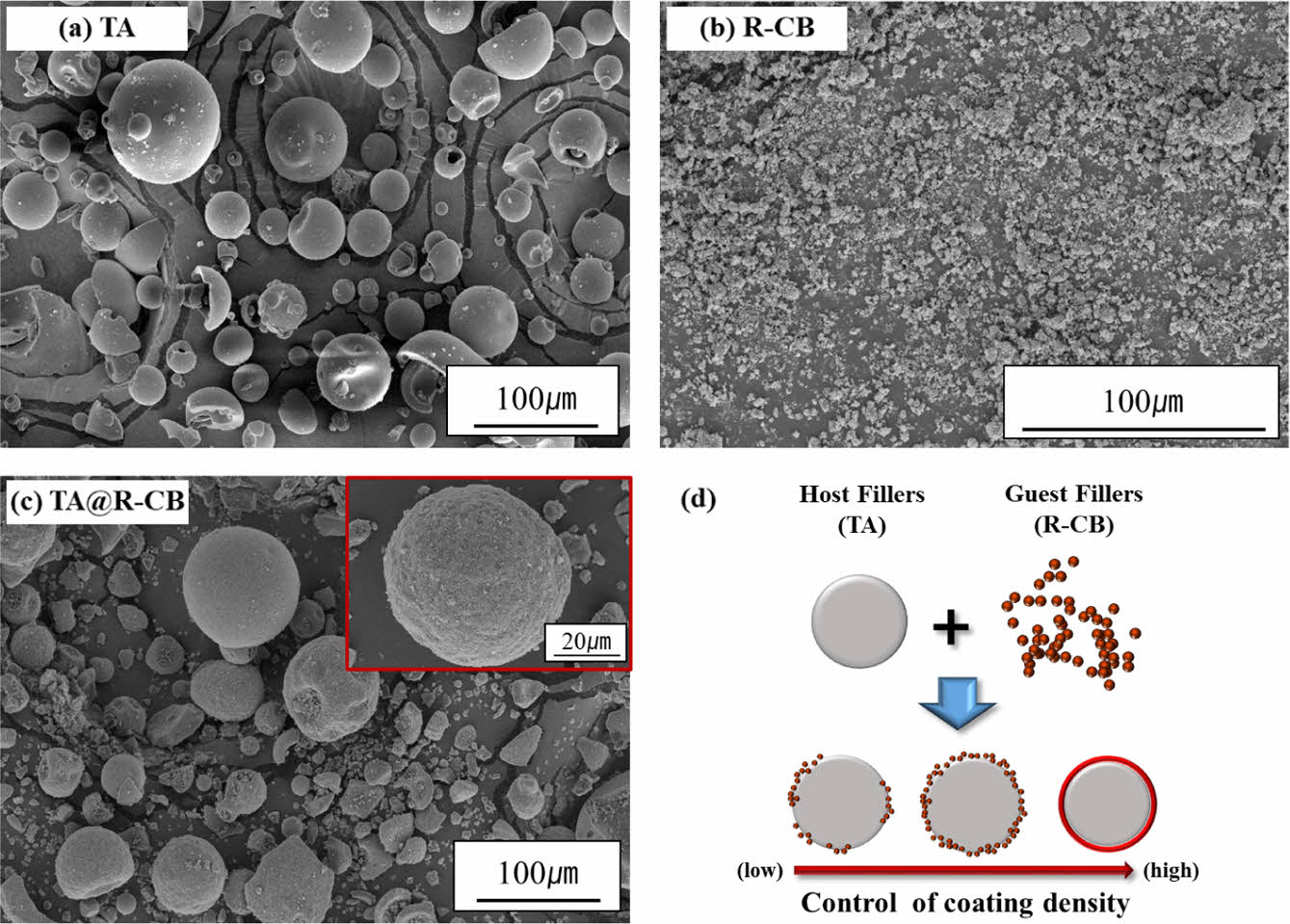 결과이다. Figure 1(a)는 구형의 형상으로 TA의 전형적인 모습을 볼 수 있으며, Figure 1(b)는 폐타이어로부터 분말화한 R-CB이다. 측정결과로부터 R-CB 입자의 평균 크기가 1-5 mm로 다양한 형상 이미지를 관찰할 수 있다. Figure 1(c)는 건식입자합성법을 이용하여 합성한 TA@R-CB 구조의 복합입자로 구형의 TA 표면에 R-CB가 균일하게 코팅되었음을 알 수 있다. R-CB의 코팅은 TA의 크기와는 무관하게 모든 표면에 일정한 두께로 코팅되었다. 즉, 두 입자간의 물리화학적 코팅으로 TA@R-CB의 코어쉘 구조가 형성되었고, Figure 1(d)는 복합입자를 합성하는 방법을 간략히 도식화한 것이다.