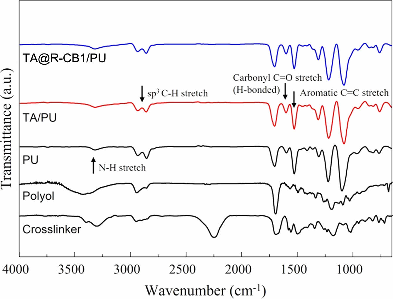 Figure 2 FTIR of neat PU, TA/PU, and TA@R-CB1/PU adhesives (Filler content: 1 wt%). |