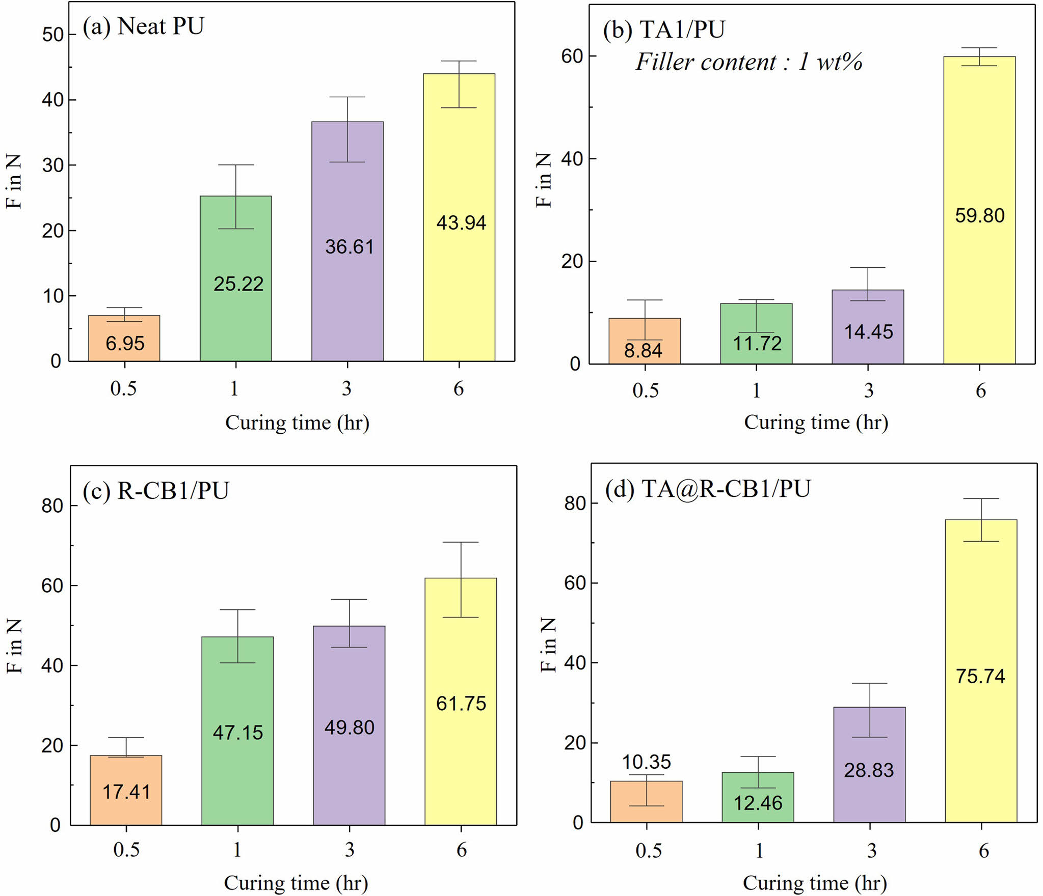 Figure 3 Comparison of adhesion strength of PU adhesive according to flame retardant type and curing time (Filler content 1 wt%): (a) neat PU; (b) TA1/PU; (c) R-CB1/PU; (d) TA@R-CB1/PU. |