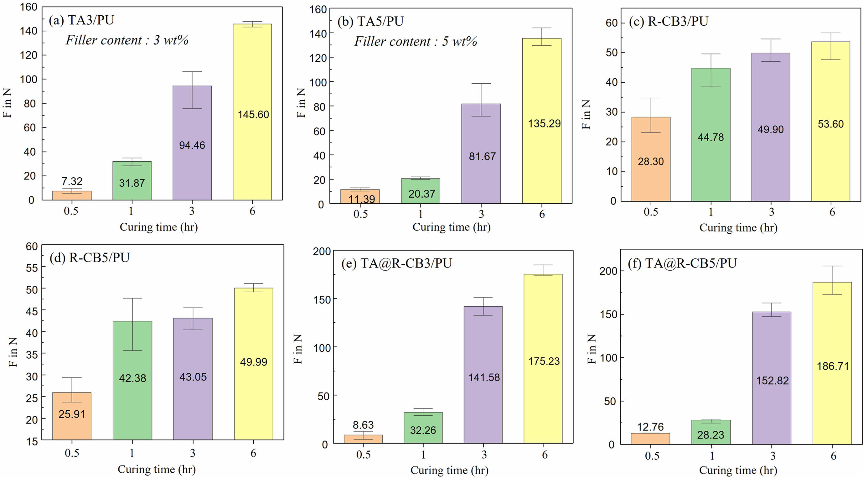 Figure 3(b-d)는 첨가제의 함량이 1 wt%일 때 접착력을 측정한 결과로 경화시간 30분일 때 기준시료는 6.95 N이었으나, TA, R-CB 그리고 TA@R-CB를 각각 첨가한 경우에는 8.84 N, 17.41 N, 10.35 N으로 최대 150% 가량 증가하였다. 특히 경화시간이 6시간일 경우에는 43.94 N에서 75.74 N으로 72.37% 증가하였다. 이와 같은 접착력의 증가는 앞서 언급한 PU 자체의 강한 네트워크 구조의 형성과 더불어 표면에 다량의 극성 기능기와 수소결합이 존재하는 필러의 첨가로 물성향상의 가속화에 기인한 원인으로 볼 수 있다. 아울러 단일 첨가제를 사용한 경우보다 두 입자를 하나의 복합입자(TA@R-CB)로 이용한 PU의 경우가 가장 우수한 물성을 보인 것은 복합입자와 PU 간의 강한 계면특성을 유도하고 서로 다른 특성의 입자를 함께 사용함으로써 기대할 수 있는 시너지 효과로 생각할 수 있다.