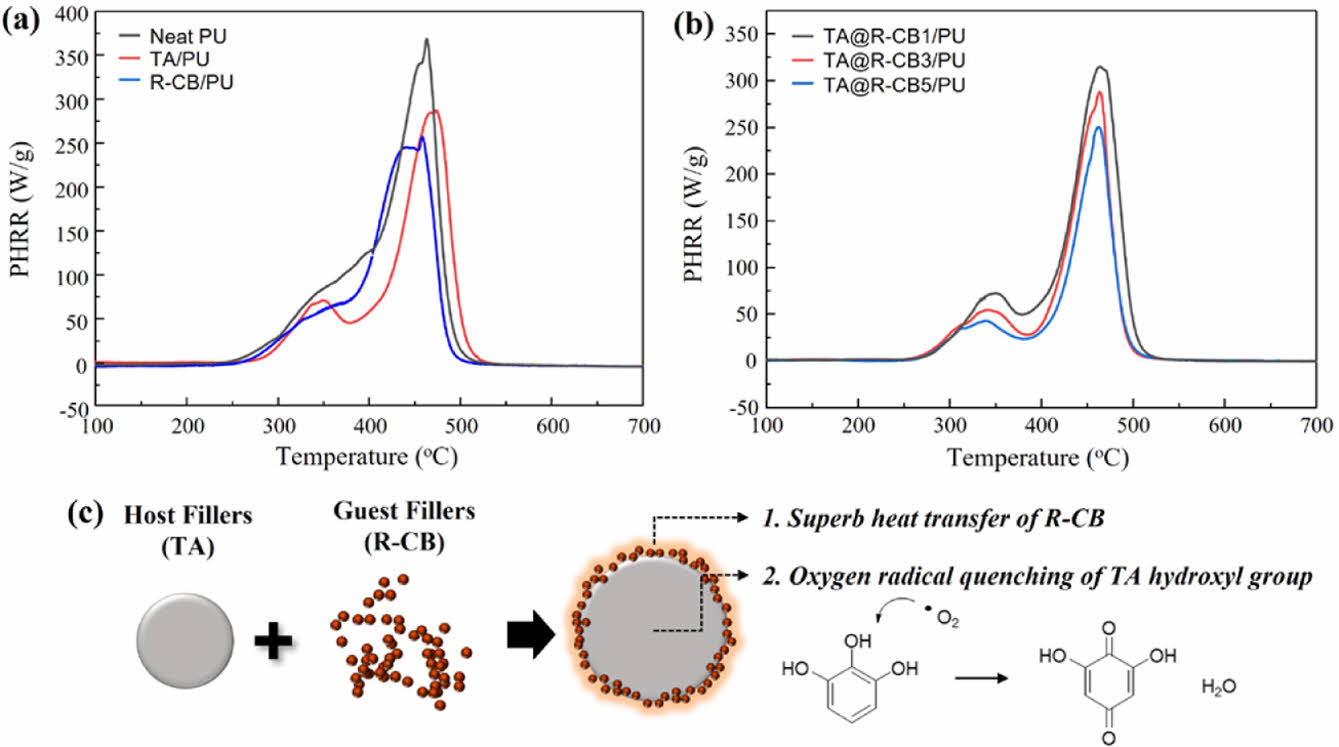 일반적으로 TA는, 연소시에 발생할 수 있는 O2 라디칼이 TA의 hydroxyl 그룹(-OH)과 반응하여 연소반응을 비활성화하며, 흑연(char)를 형성하여 외부의 산소를 차단하여 연소거동을 감소시키기 때문에 난연 특성을 가질 수 있다.12 아울러 R-CB는 유기물인 TA보다 상대적으로 높은 열적 안정성을 가지고 있고 다량의 -OH 관능기로 인한 난연성을 기대할 수 있다.31