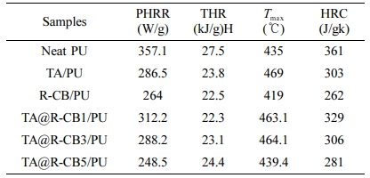 Figure 5는 본 연구에서 제조된 PU의 난연성을 평가한 결과이다. Figure 5(a-b)는 micro combustion calorimetry(MCC)을 측정한 결과로 난연제의 종류에 따라서 서로 다른 난연성을 나타낸다.