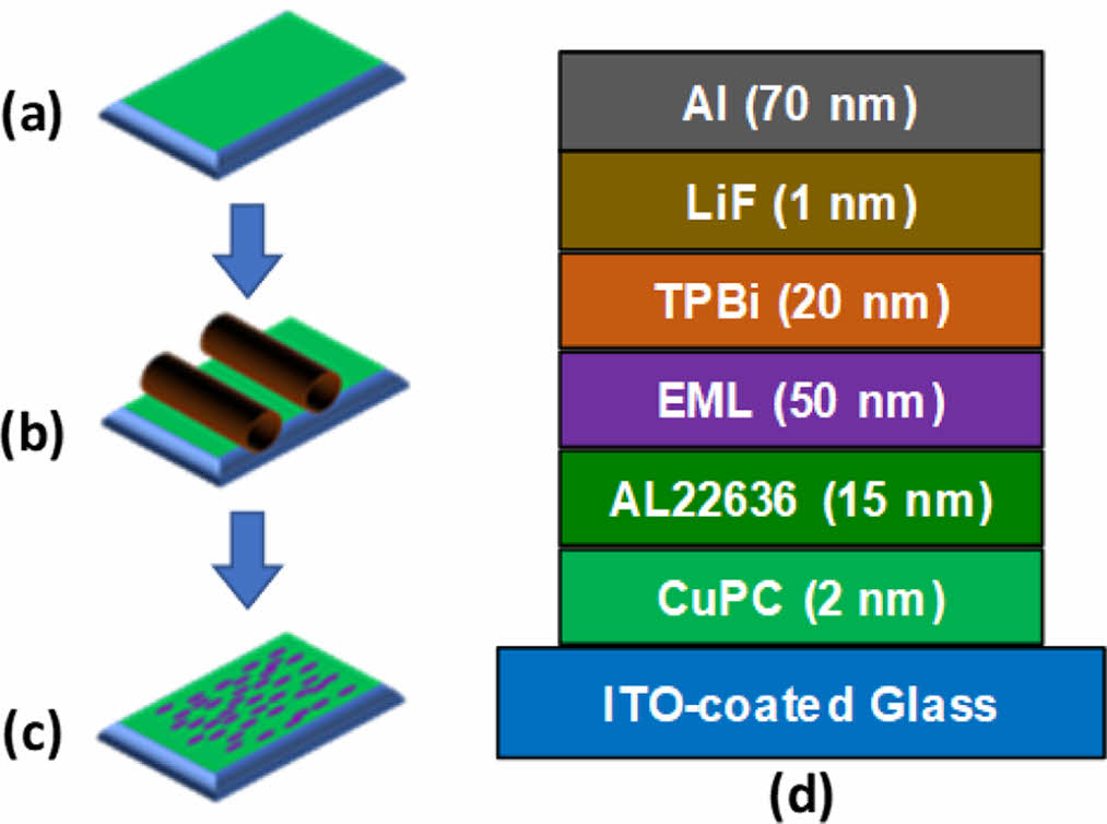 Fabrication of aligned emissive layer (EML): (a) spin coating of PI alignment layer on ITO surface; (b) rubbing process; (c) spin coating of copolymers and thermal annealing at 270 ℃ for 10 min; (d) multilayer structure of EL device.