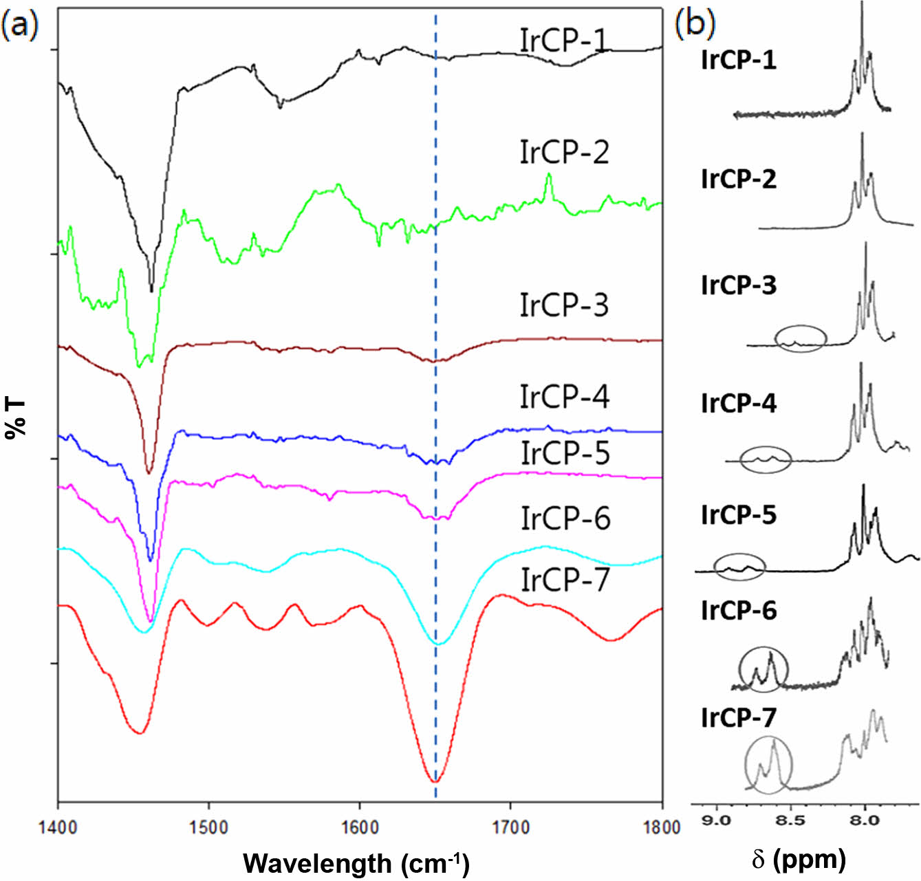 (a) Normalized FTIR spectra of copolymers (KBr pellet); (b) 1 H NMR spectra of copolymers (s = CDCl3): the circles indicate NMR resonance for Ir(piq)2.