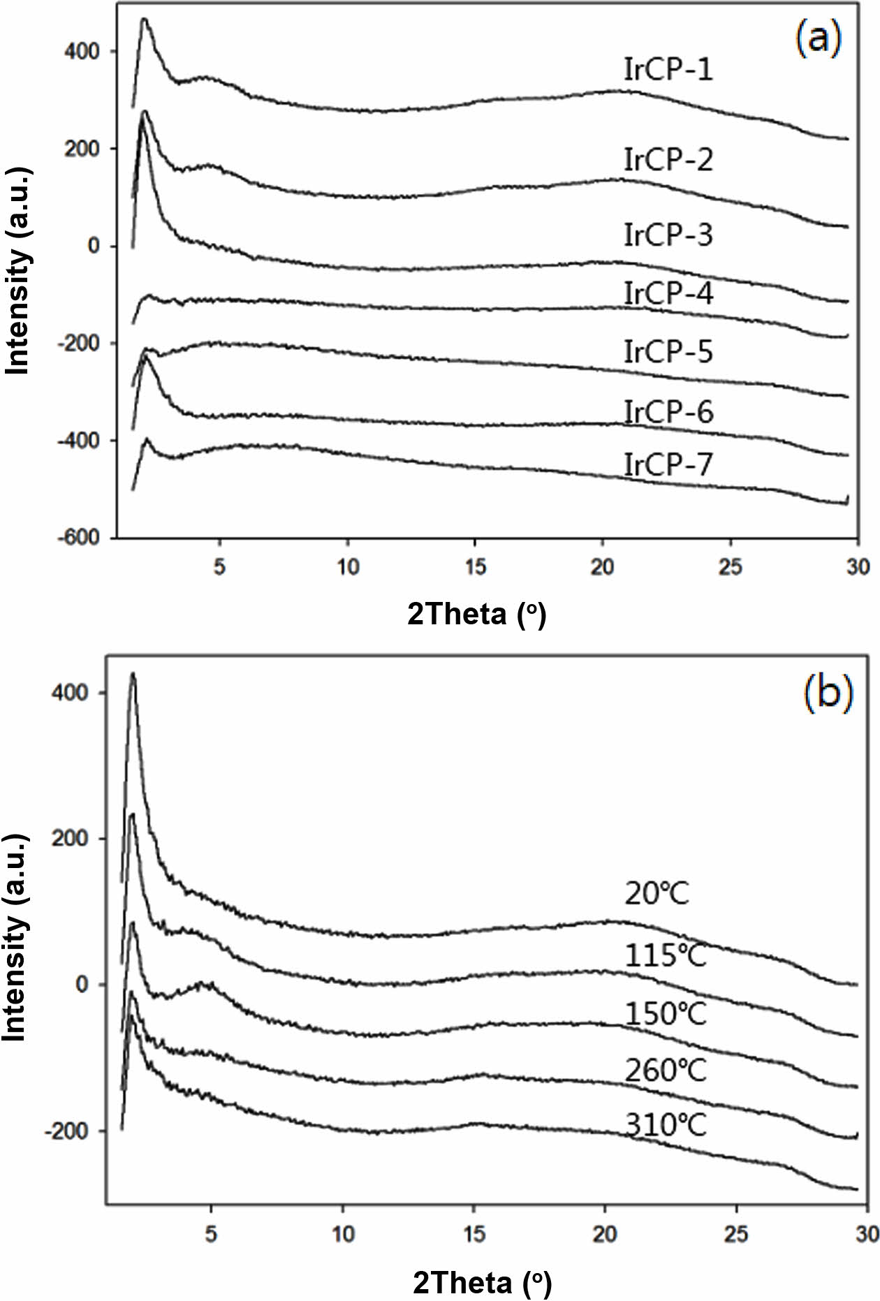 (a) X-ray diffraction (XRD) patterns of copolymers; (b) XRD patterns for IrCP-3 measured at given temperature.