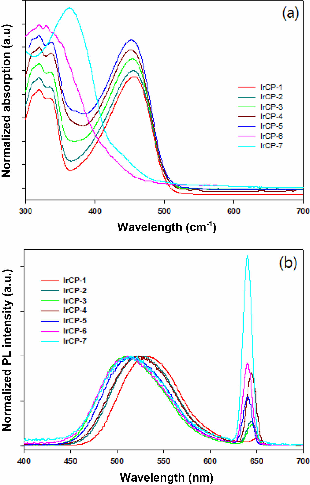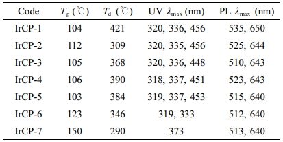 Photophysical and Electrochemical Properties. UV-Vis absorption and PL data of copolymers were measured in dilute chloroform solution and excitation wavelength for PL measurements was 319 nm. The resulting spectra are shown in Figure 4 and summarized in Table 2. It is obvious that copolymers IrCP-1 to IrCP-5 showed similar absorptions around 320 nm, 336 nm and 456 nm. When the content of iridium-monomer increases, the absorptions around 320 nm and 336 nm become progressively stronger compared to those at 456 nm. As in IrCP-6, a further augmentation of iridium load caused broadening the absorption peak and minor shifting to 319 nm and 333 nm with trace absorption of 450 nm. Finally, IrCP-7 exhibited the strongest single absorption peak at 373 nm due to iridium complex moiety. This implies that the effect of introduction of iridium appears gradually until the composition of iridium-monomer is about 10 mol%, but it becomes predominant at about 30 mol% through 15 mol% intermediate steps.