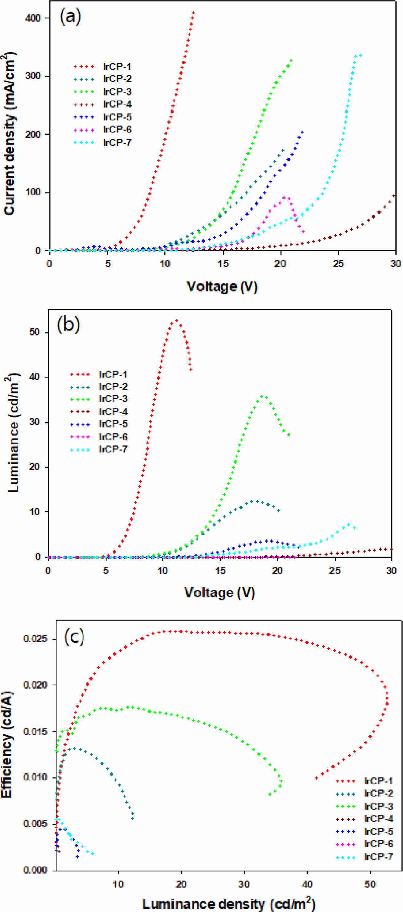 Plots of (a) current density vs. voltage; (b) luminance vs. voltage; (c) current efficiency vs. luminance density.