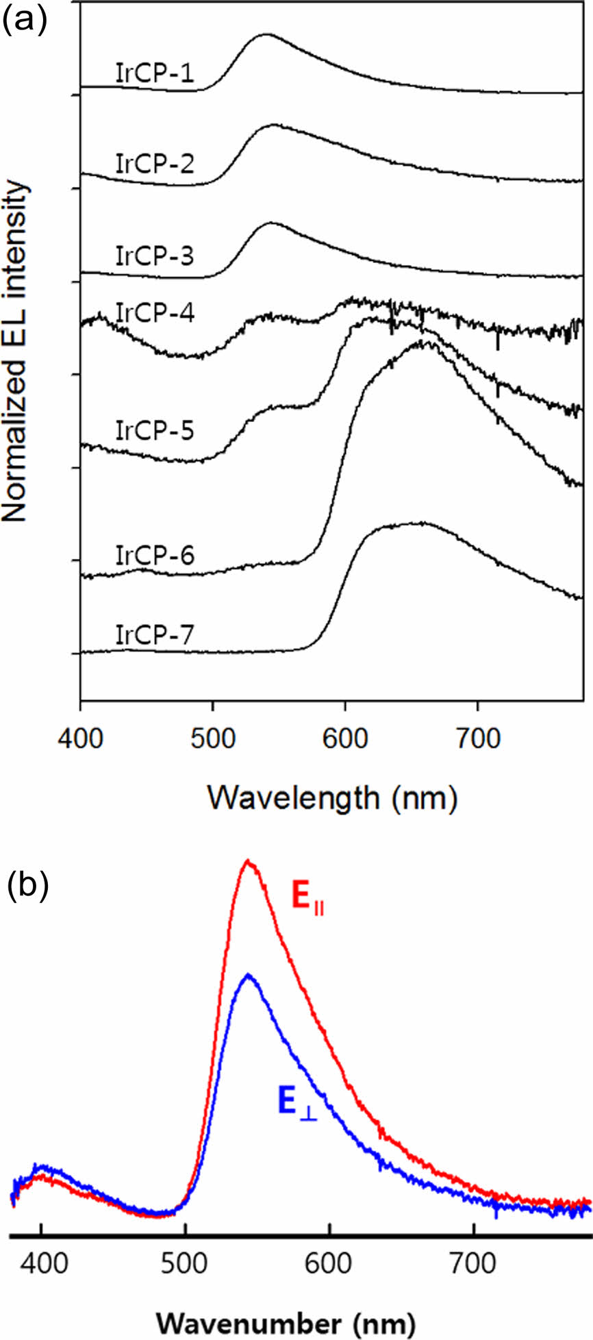 a) EL spectra of copolymers; (b) EL spectra of IRCP-3 measured with the polarization parallel (||) and perpendicular (⊥) to the rubbing direction.