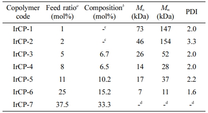 aContent of iridium-monomer. bEstimated from 1H NMR. cNMR-resonance for IrCP-1 and IrCP-2 was too weak to calculate composition. dCopolymer with 37.5 mol% feed ratio of iridium-monomer provided no GPC information due to its poor solubility in THF.