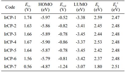 Cyclic voltammetry measurements were performed to study the electrochemical properties of copolymers. Ferrocene was used as internal standard. The onset oxidation potential of ferrocene, Eox(ferrocene) in THF and chloroform were measured as 0.57 V and 0.49 V, respectively. The HOMO and LUMO energy levels were calculated according to the empirical formula as shown in Table 3. As a result of CV measurements, it was found that bandgaps of copolymers seem to get narrower with increasing iridium load.