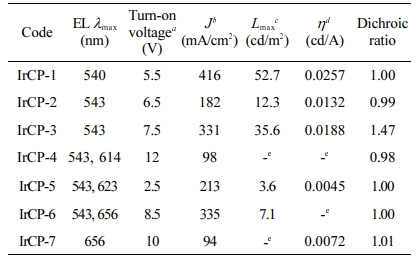 Regarding electroluminescence, the high iridium load caused attenuation in current efficiency probably due to strong TTA. Among all copolymers, EL device of IrCP-1 with the iridium-monomer content of 1 mol% in the feed ratio shows the highest brightness, current density and efficiency. This might be attributed to efficient intramolecular energy transfer from the host to the guest. The important point to note is that a satisfactory dichroic ratio of 1.47 was achieved on the device based on IrCP-3 with the iridium-monomer content of 6.7 mol% in the copolymer composition.