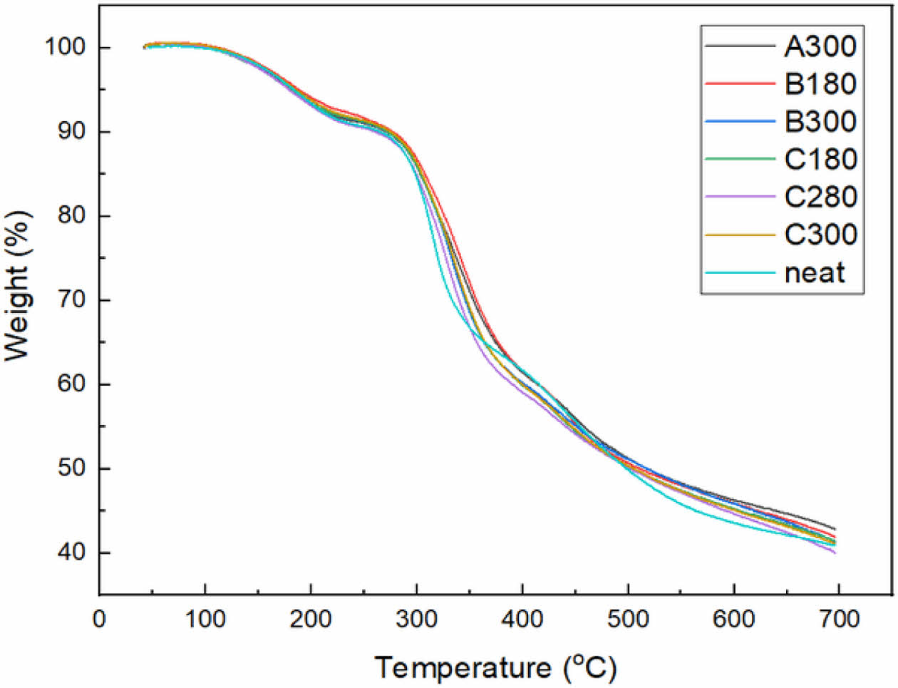 Thermogravimetric Analysis(TGA). 미국PerkinElmer사의 TGA4000을 사용하여 폼의 내열성을 분석하였다. 질소 분위기 하에서 40 ℃부터 700 ℃까지 가열하였으며 승온 속도는 10 ℃/min으로 설정하였다.