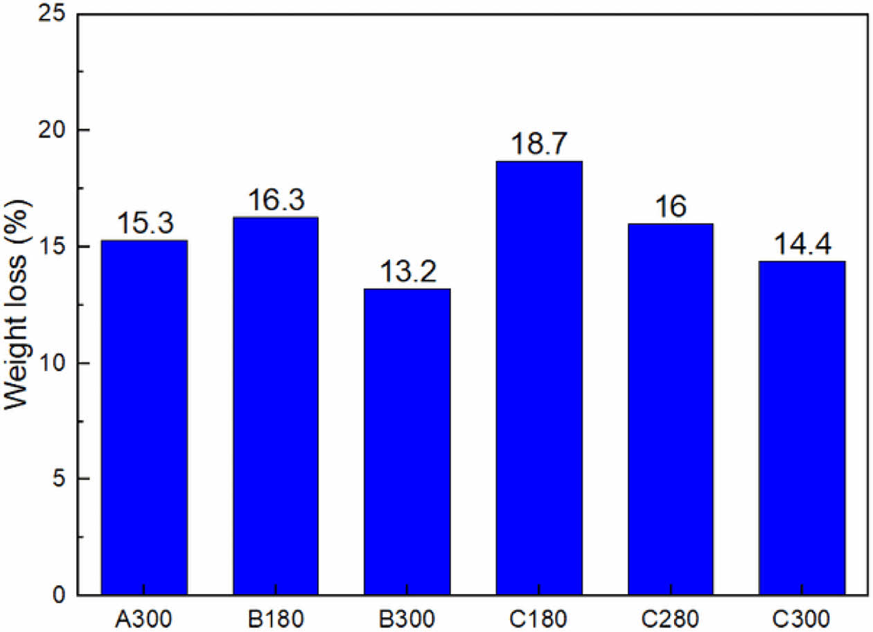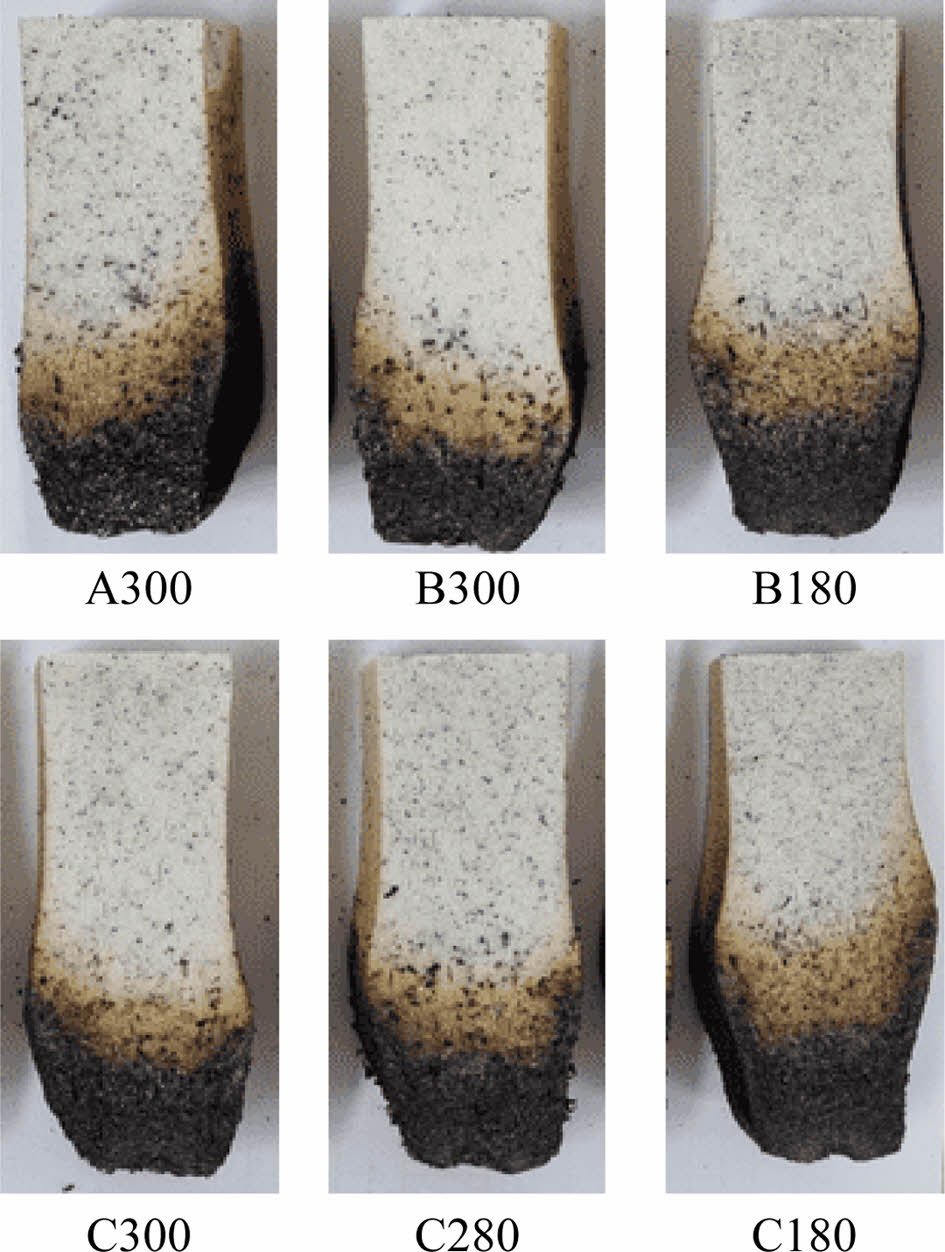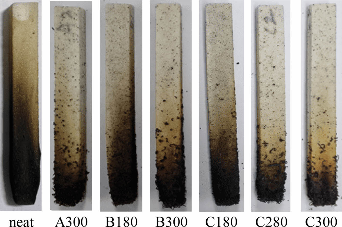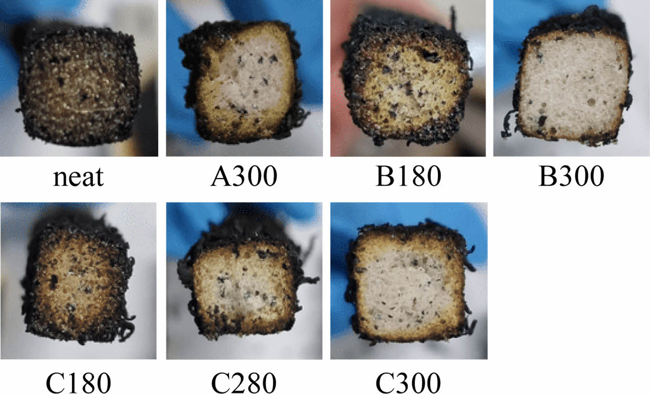 팽창흑연 입자크기 및 팽창률에 따라 폼이 손실되는 정도를 자세하게 분석하기 위해 UL94 V test에서 불꽃 및 시료의 크기, 연소 시간을 증가시켜 테스트를 진행하였다. 연소 전과 연소 후 질량을 측정하고 질량손실률을 계산하여 Figure 8에 나타내었다. 또한 연소 후 탄화층의 두께를 비교하기 위해 연소 방향으로 폼의 절단하여 Figure 9에 나타내었다. 팽창흑연의 입자크기에 따른 연소 정도는 B180, B300 및 C180, C280, C300을 통해 비교할 수 있다. 입자크기가 작을수록 연소시 열이 폼 내부에 깊숙이 침투하여 질량손실률이 높았으며, 탄화된 층의 두께도 두껍게 나타나는 것을 알 수 있다. 팽창률에 따른 폼의 연소 정도는 입자크기가 동일한 A300, B300, C300을 통해 비교할 수 있다. 팽창률이 가장 적은 A300에서 탄화된 영역이 가장 크고 질량손실률이 높게 나타났으며 팽창률이 가장 큰 B300에서는 탄화된 영역이 비교적 작게 나타났다. 따라서 입자크기 및 팽창률이 클수록 폴리우레탄 폼의 난연성능이 향상됨을 확인할 수 있었다.