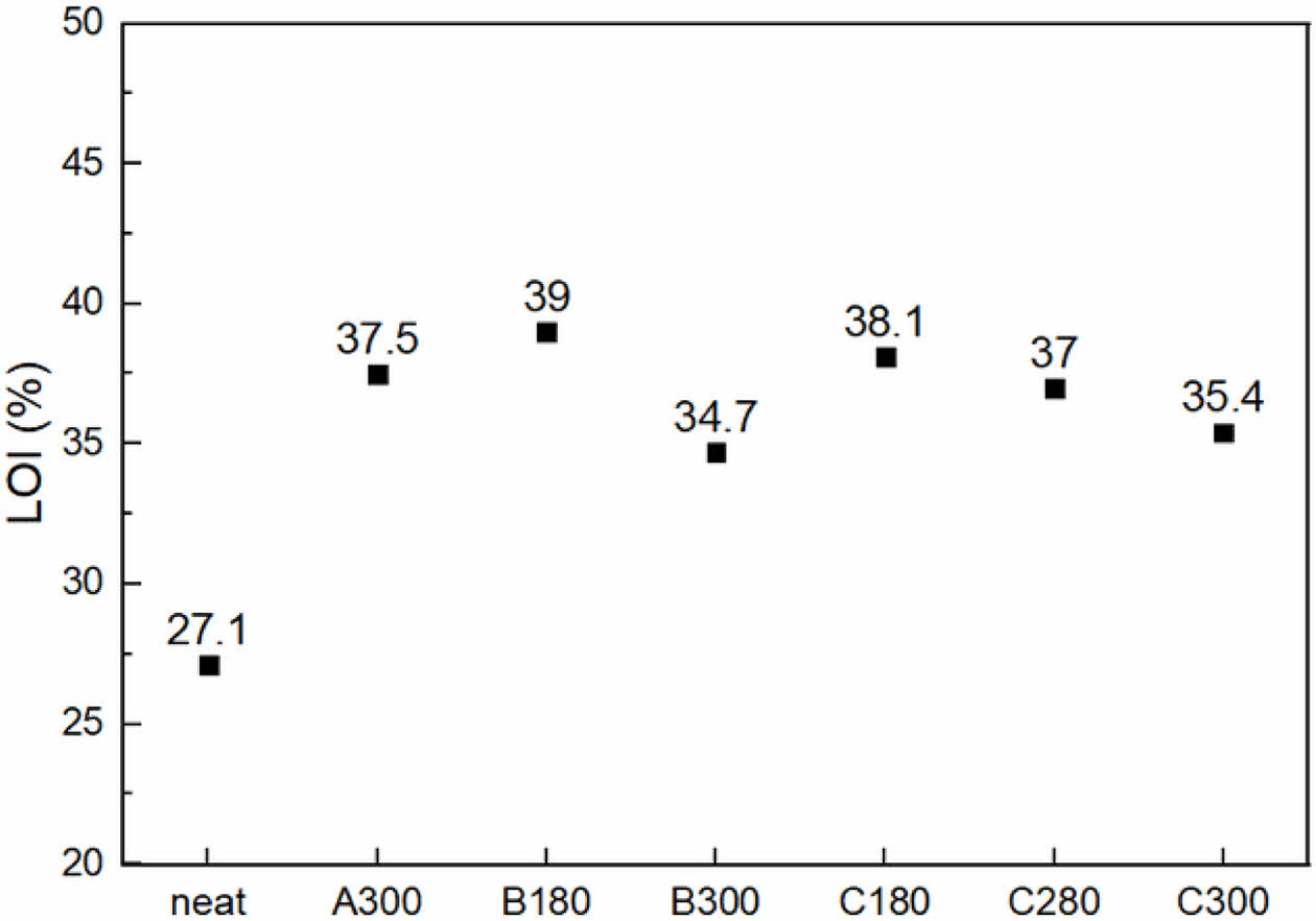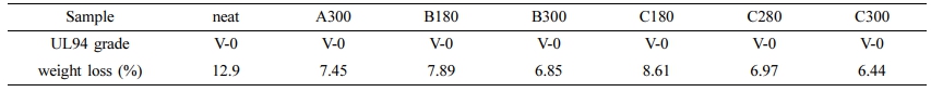 팽창흑연 종류에 따른 폴리우레탄 폼의 난연성 분석. 팽창흑연 종류에 따른 폴리우레탄 폼의 난연성을 알아보기 위하여 UL94 V test 및 LOI 측정을 진행하였다. UL94 V test 결과는 Table 3에 나타내었다. 모든 샘플이 1차 및 2차 점화에서 불이 붙지 않고 V-0 등급으로 평가되었다. 따라서 자세한 분석을 위해 UL94 V test 후 연소한 폼의 모습을 비교하였고 테스트 전과 후에 각 종류마다 5개 시료의 질량을 측정해 연소에 의해 손실되는 질량의 평균을 계산하였다. Figure 5에서 neat 폼은 팽창흑연을 첨가한 폼들에 비해 탄화된 영역이 넓게 나타났다. UL94 V test 후 neat 폼은 평균 12.9%의 질량 손실이 일어났지만 팽창흑연을 첨가한 폼은 6-9%의 질량 손실이 일어나 약 3-6%가 개선되는 것을 확인할 수 있었다. 이는 팽창된 흑연의 char층이 열과 산소를 차단하는 역할을 수행하여 폼의 연소성을 저하시키기 때문이다. 또한 팽창흑연 입자크기에 따른 폼의 연소 정도를 비교했을 때 입자크기가 180 μm인 B180과 C180의 질량 손실률은 각각 7.89%와 8.61%로 입자크기가 280-300 μm인 폼에 비해 더 많은 질량 손실이 일어났다. 입자크기가 클수록 생성되는 char의 부피가 커져 열 차단막 역할을 수행하는 능력이 우수해지는 것이다.