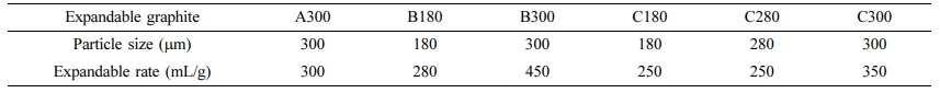 재료. 폴리올은 OH-value가 282.8 KOH/g인 한국 롯데케미칼㈜의 PIA base의 polyester polyol을 사용하였다. 이소시아네이트는 NCO%가 31.0%인 독일 BASF사의 M50을 사용하였다. 실리콘 계면활성제는 독일 Evonik사의 B8462를 사용하였다. 인계 난연제는 중국 Jiangsu Yoke Technology사의 triethyl phosphate(TEP)를 사용하였다. 미국 Air products사의 amine계 촉매 pentamethyldiethylenetriamine(PC-5)를 발포 촉진 촉매로 사용하였으며, 30% diethylene glycol + 70% potassium octoate(K-15)는 삼량화 촉매로 사용하였다. 발포제는 미국 Honeywell사에서 제조된 trans-1-chloro-3,3,3-trifluoropropene (HFO-1233zd(E))를 사용하였다. 팽창흑연은 Sigma-Aldrich 및 독일 AMG Graphite(Graphit Kropfmühl)사의 제품을 구입하였으며 팽창흑연에 대한 자세한 정보는 Table 1에 나타내었다.