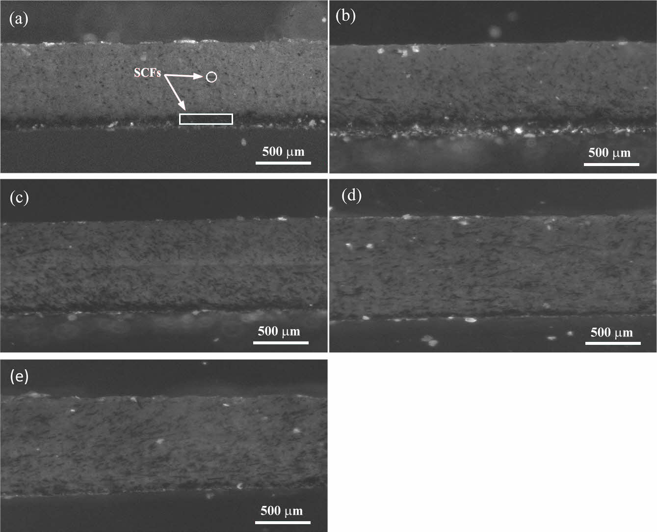Longitudinal Section Morphology. The optical image of the longitudinal section of PVA/SCFs/Tween80 composites are shown in the Figure 2. From the optical image, it could be seen that SCFs with different content of Tween80 had different dispersion in the PVA matrix. Figure 2(a) clearly shows that SCFs in the PVA/SCFs sample without Tween80 has more deposition at the bottom. The optical image shown in Figure 2(b)-(e) shows the effect of different Tween80 content on the dispersion of SCFs in the PVA matrix. The added Tween80 would be adsorbed on the surface of SCFs, so that the SCFs were coated with a layer of polyelectrolyte, which acted as an electrostatic steric hindrance to achieve dispersion. It could be seen that the addition of Tween80 improves the deposition of SCFs in the matrix to a certain extent. Moreover, the dispersion of SCFs in the matrix was improved with the increase of Tween80 content in a certain range.