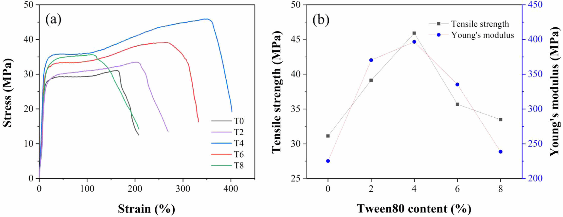 Tensile properties of PVA/SCFs/Tween80 composites with different Tween80 contents: (a) stress-strain curves of PVA/SCFs/ Tween80 composite films; (b) tensile strength, Young’s modulus of PVA/SCFs/Tween80 composites.