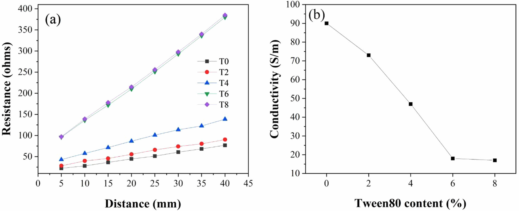 Electrical properties of PVA/SCFs/Tween80 composites with different Tween80 contents: (a) resistance curves; (b) electrical conductivity.