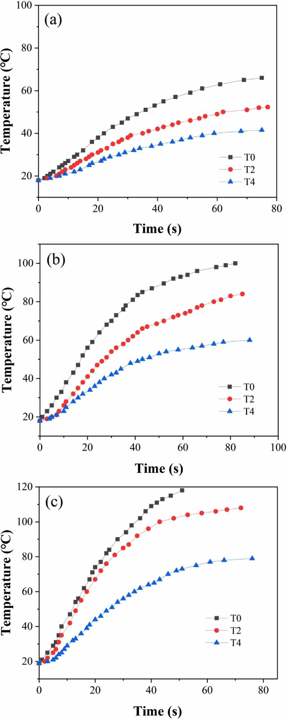 The relationship between surface temperature and applied voltage of T0, T2, and T4 samples are shown in Figure 5. The surface temperature of composite films was measured with a digital thermocouple (VC890, China) at 5, 7, and 9 V voltages. Over time, the surface temperature continued to rise due to the joule heat generated by the electric current. Obviously, the lower the resistance, the more joule heat generated at the same voltage. At 9 V voltage, the T0, T2, and T4 samples all reached the temperature of Tg (52.6 ℃) before 30 s, which satisfied the requirement of realizing the electroactive shape memory effect on the PVA/SCFs/Tween80 composites.23 However, under the voltage of 7 V, the T2 sample needed to be energized for more than 75 s to reach Tg, while the T4 sample failed to reach Tg because of its high resistance and the temperature did not rise when the heat generation and heat dissipation were balanced. On the other hand, higher voltages caused surface temperatures to rise faster. In summary, voltage and electrical conductivity were the key factors affecting shape memory effect.